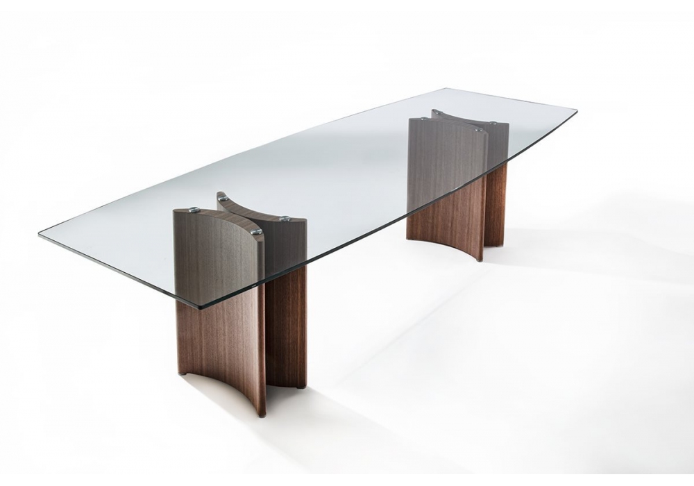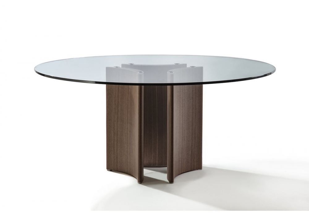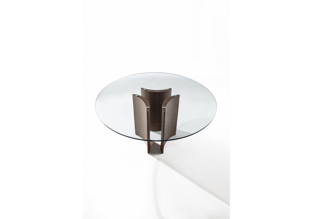 Alan Beine C von Gabriele und Oscar Buratti für Porada entworfen ist ein Tisch mit Sockel aus Halbmondelementen in Canaletta Walnuss und transparenter Glasplatte. Aderendhülsen aus schwarzem Chrommetall. Erhältlich in verschiedenen Größen in der runden, tonnenförmigen und rechteckigen Ausführung.
