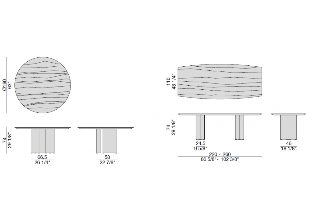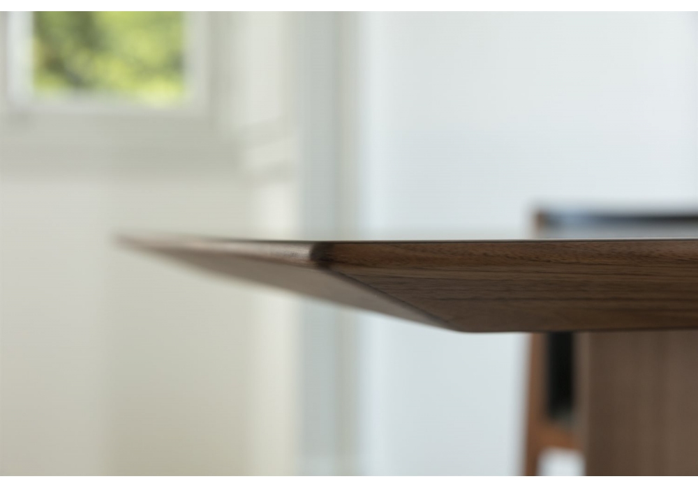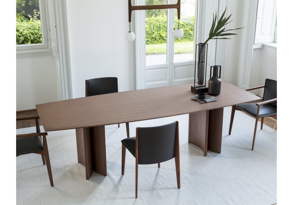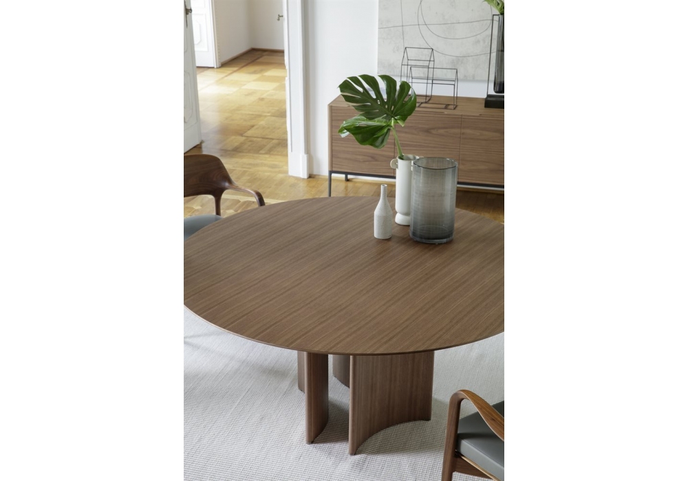 Alan Beine L von Gabriele und Oscar Buratti für Porada entworfen ist ein Tisch mit Sockel aus Halbmondelementen in Canaletta Walnuss und Holzplatte. Metallspitzen in schwarz verchromt. Erhältlich in verschiedenen Größen in der runden und rechteckigen Version.