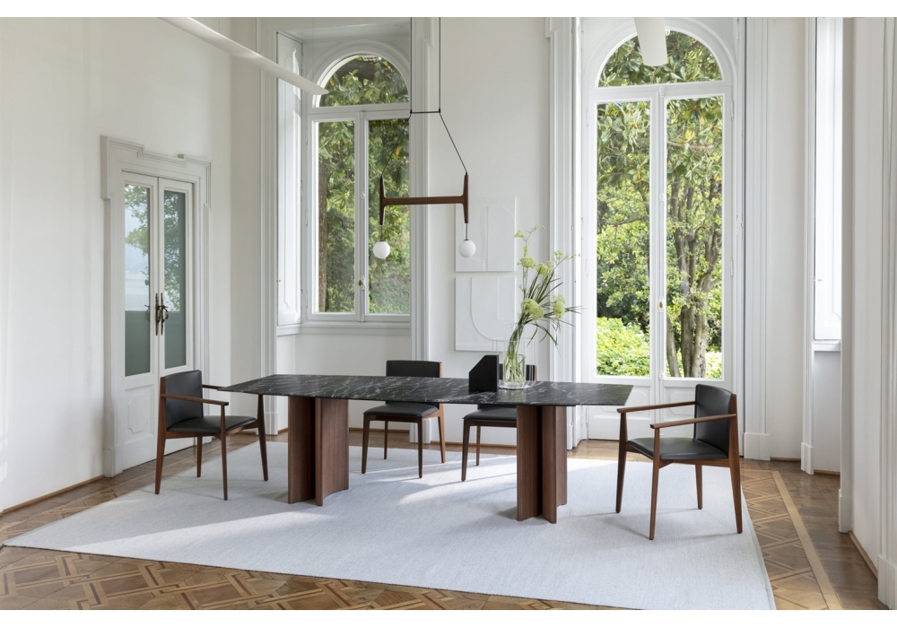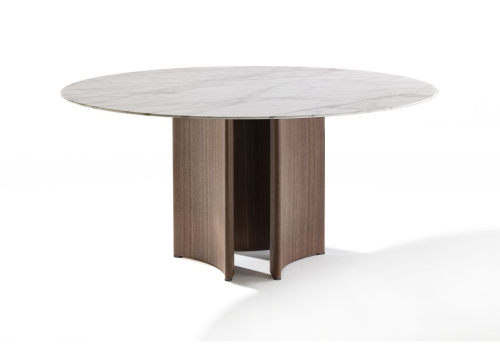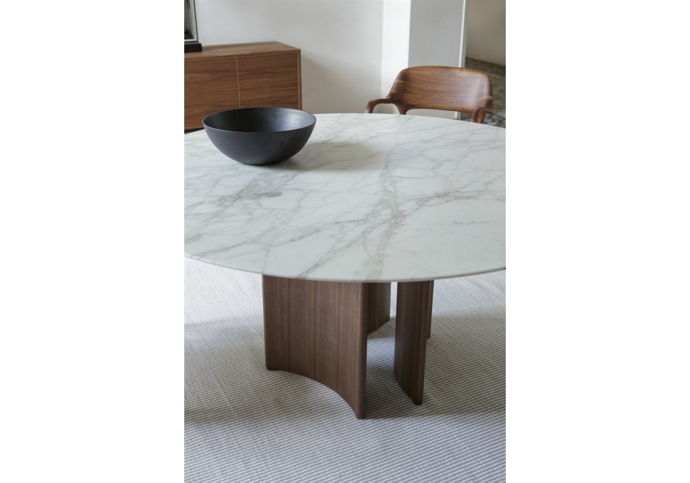 Alan Beine M von Gabriele und Oscar Buratti für Porada entworfen ist ein Tisch mit Sockel aus einzelnen oder kombinierten Halbmondelementen in Canaletta Walnuss und Marmorplatte. Metallspitzen in schwarz verchromt. Erhältlich in verschiedenen Größen in der runden und rechteckigen Version.