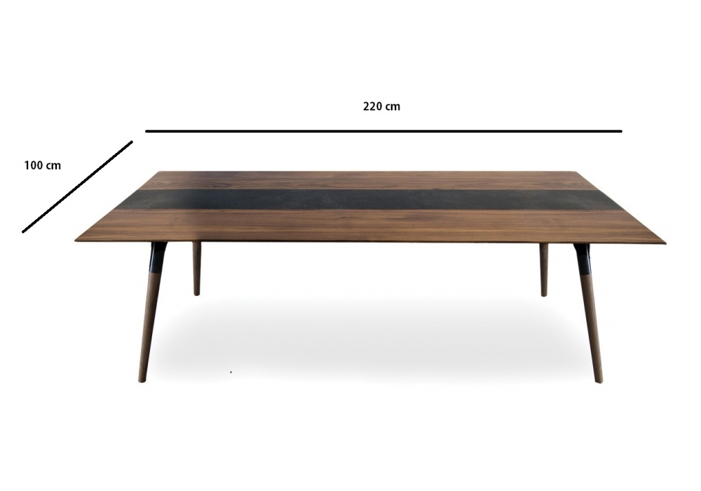Salt&Pepper von Guggenbichler für Tonon entworfen, ist ein Tisch mit Beinen aus massiver Eiche oder Canaletto-Walnuss mit Details aus poliertem, mattem oder schwarz lackiertem Edelstahl. Oberseite aus zwei Seitenwänden aus massiver Eiche oder Canaletto-Walnuss, zentrale 10 mm schwarze Oxidkeramikplatte.