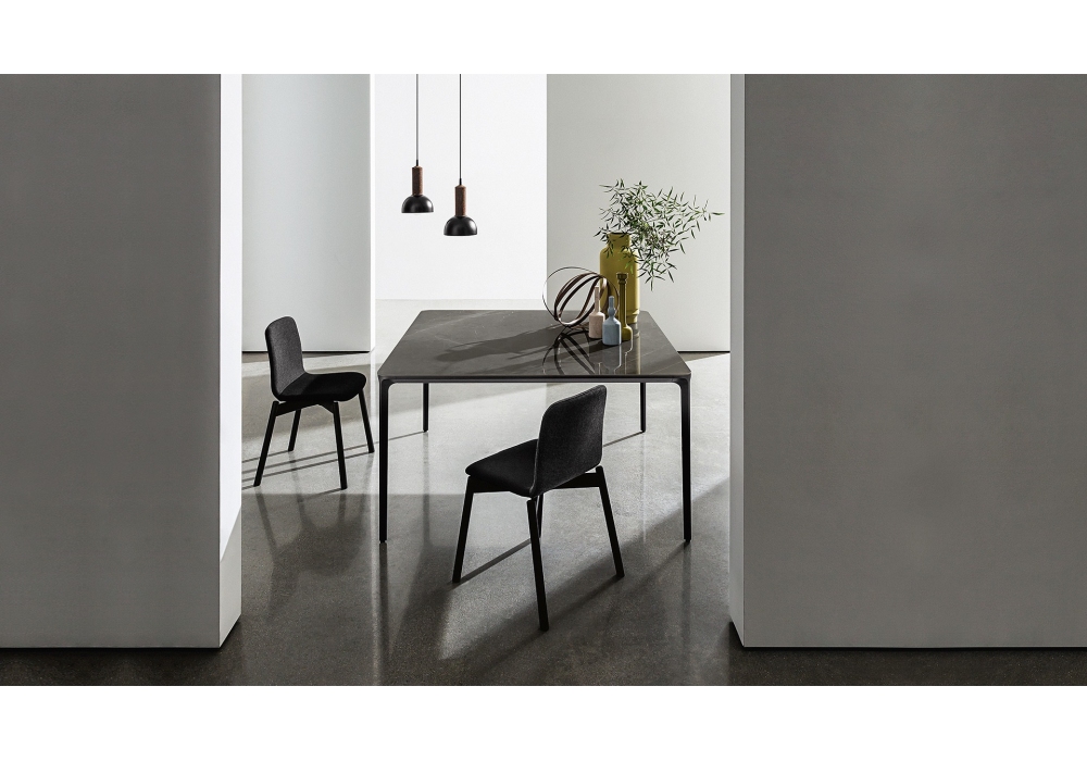 Slim von Matthias Demacker für Sovet entworfen, ist ein quadratischer Tisch mit Metallstruktur und Beinen, Glas- oder Keramikplatte. Verfügbar in mehreren Ausführungen und Abmessungen.