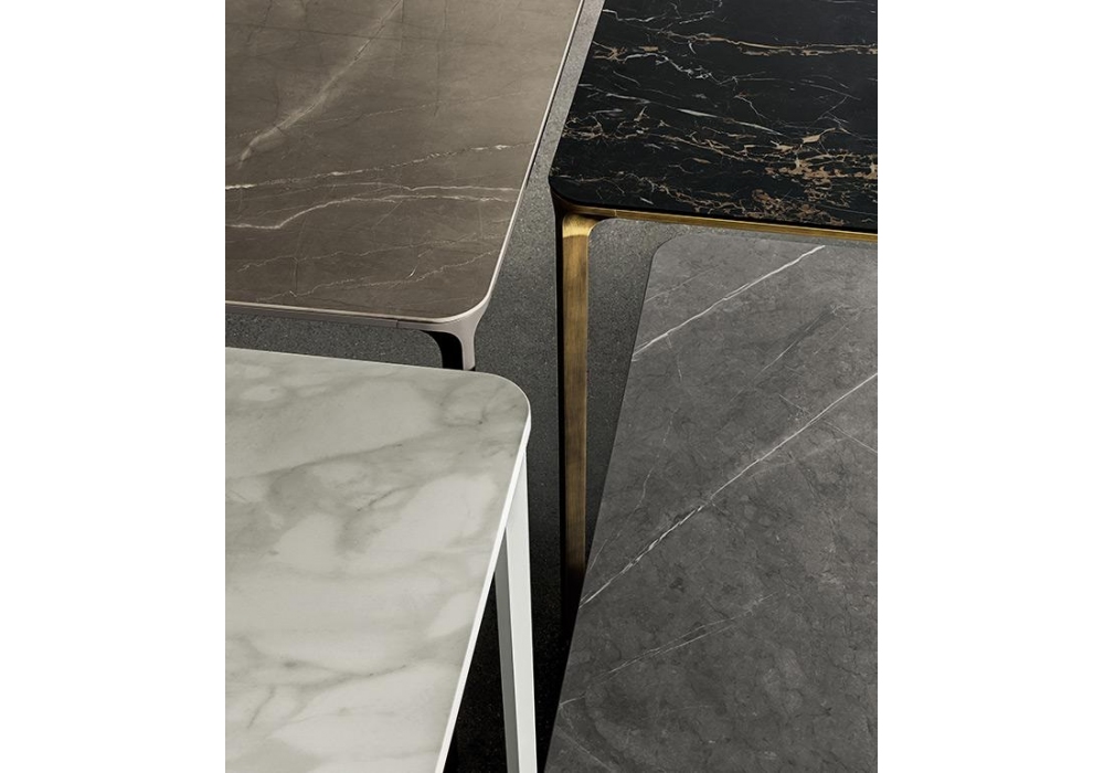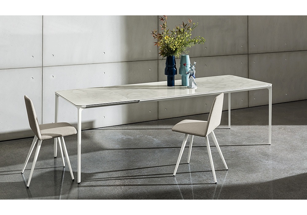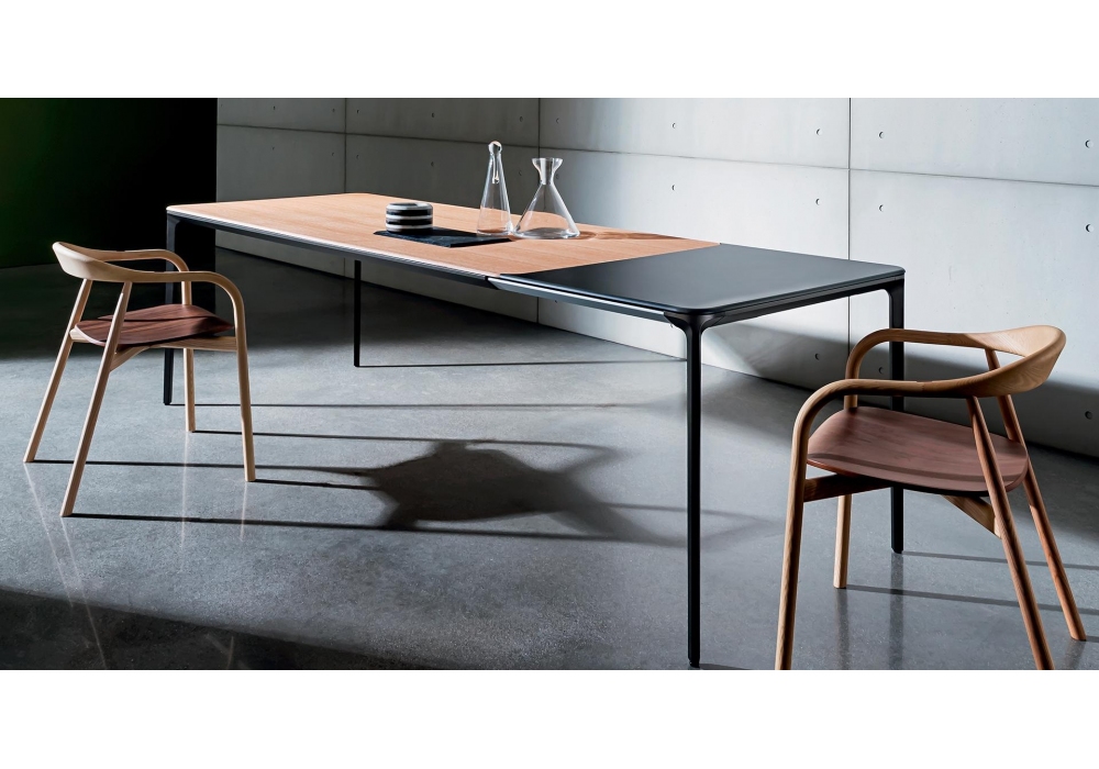 Slim von Matthias Demacker für Sovet entworfen, ist ein Erweiterbar Tisch mit Metallstruktur und Beinen, der aus Glas, Keramik, Holz oder HPL besteht. Verfügbar in mehreren Ausführungen und Abmessungen. In der Version mit Holzplatte ist die Erweiterung immer in HPL.