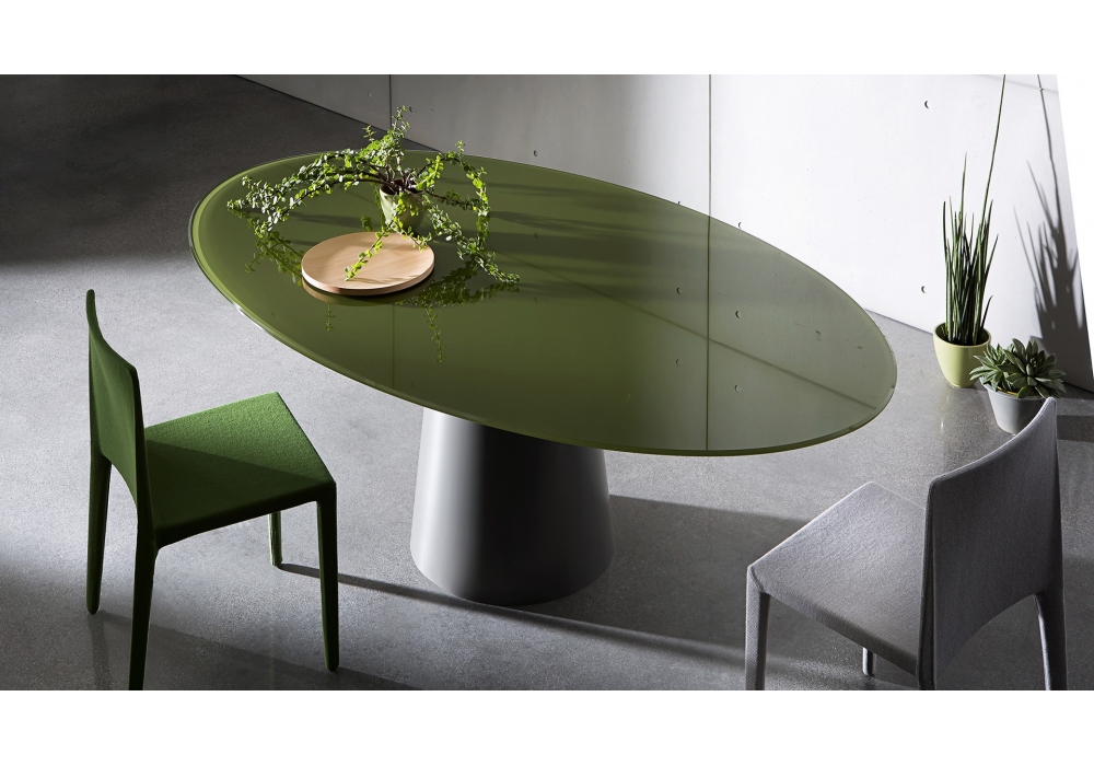 Totem von Studio Sovet für Sovet entworfen, ist ein Elliptisch Tisch mit Metallfuß und Platte aus Glas oder Keramik . Verfügbar in mehreren Ausführungen und Abmessungen.