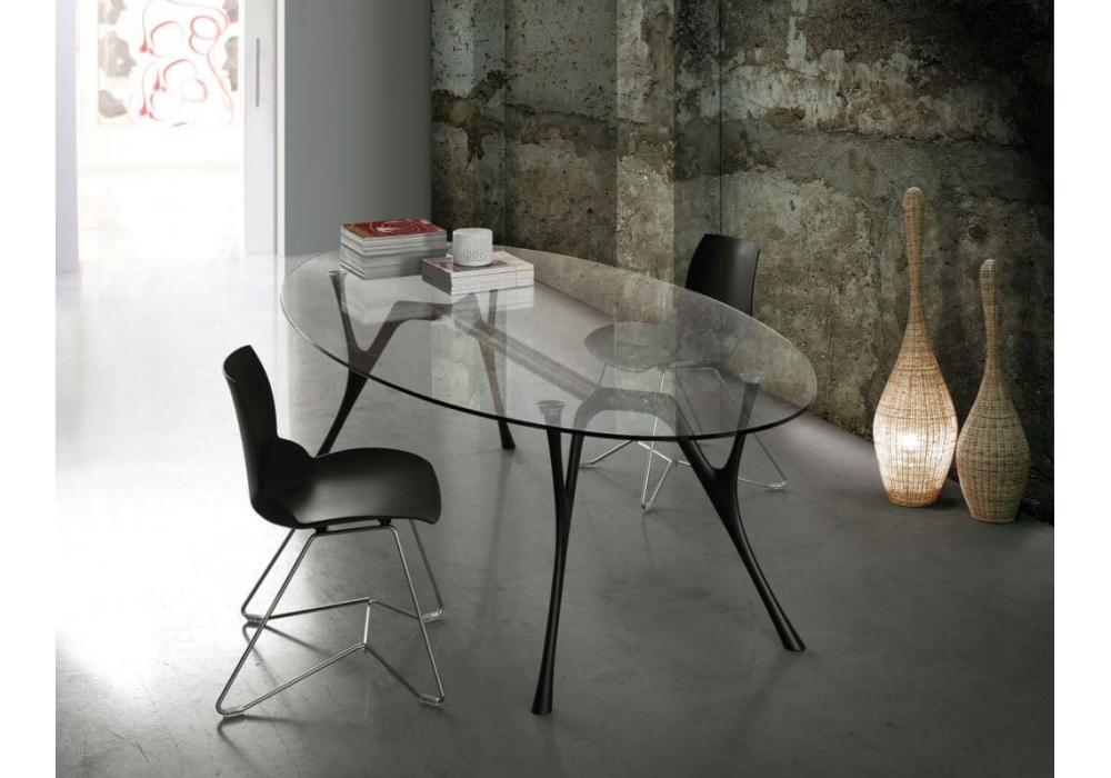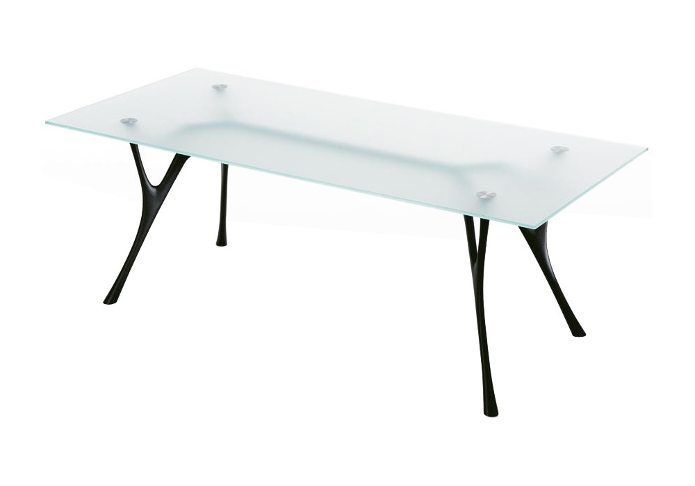 Pegaso von Angelotti und Cardile für Caimi Brevetti entworfen, ist ein Tisch mit Aluminiumstruktur und Tischplatte aus gehärtetem und abgeschrägtem transparentem oder satiniertem Glas. Die Oberseiten werden mit speziellen, oben aufgeklebten Edelstahlscheiben an der Struktur eingehängt.