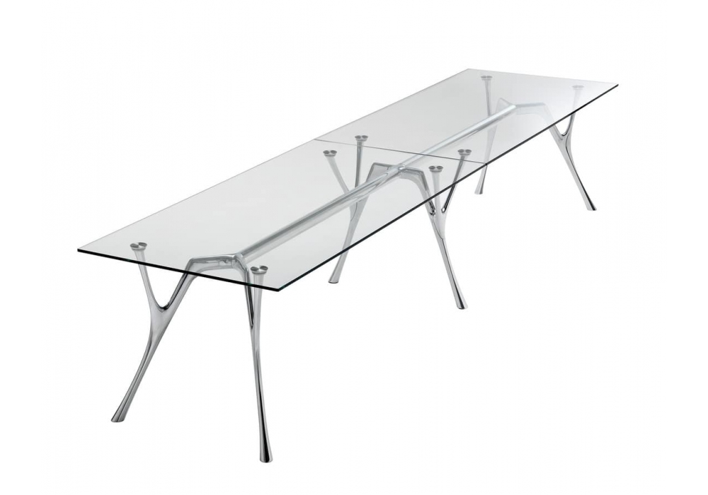 Pegaso Infinito von Angelotti & Cardile entworfen, ist ein modularer Tisch mit Aluminiumstruktur und gehärtetem Glas und abgeschrägtem Transparent oder Satin. Die Oberseiten werden mit speziellen, oben aufgeklebten Edelstahlscheiben an der Struktur eingehängt.