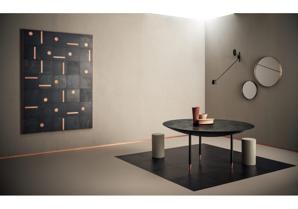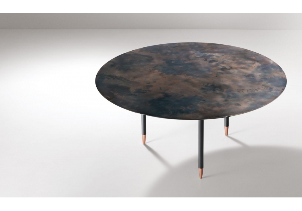 Roma von Minelli Fossati für DeCastelli entworfen, ist ein runder Metalltisch mit Sockel und Beinen aus schwarz lackiertem Eisen und Platte aus Edelstahl. Verfügbar in mehreren Abmessungen.