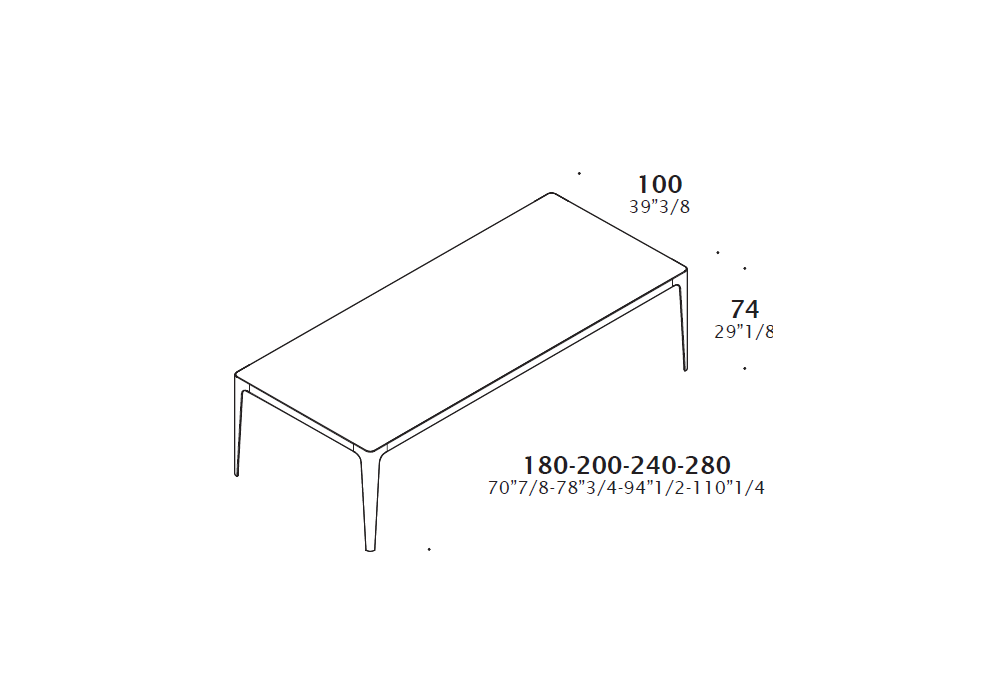 | Abmessungen | • 180 x 100 x H 74 cm; • 200 x 100 x H 74 cm; • 240 x 100 x H 74 cm; • 280 x 100 x H 74 cm; • 120 x 120 x H 74 cm; • 140 x 140 x H 74 cm; • 160 x 160 x H 74 cm; • 160-250 x 100 x H 74 cm; • 200-290 x 100 x H 74 cm; • 90-130 x 90 x H 74 cm |