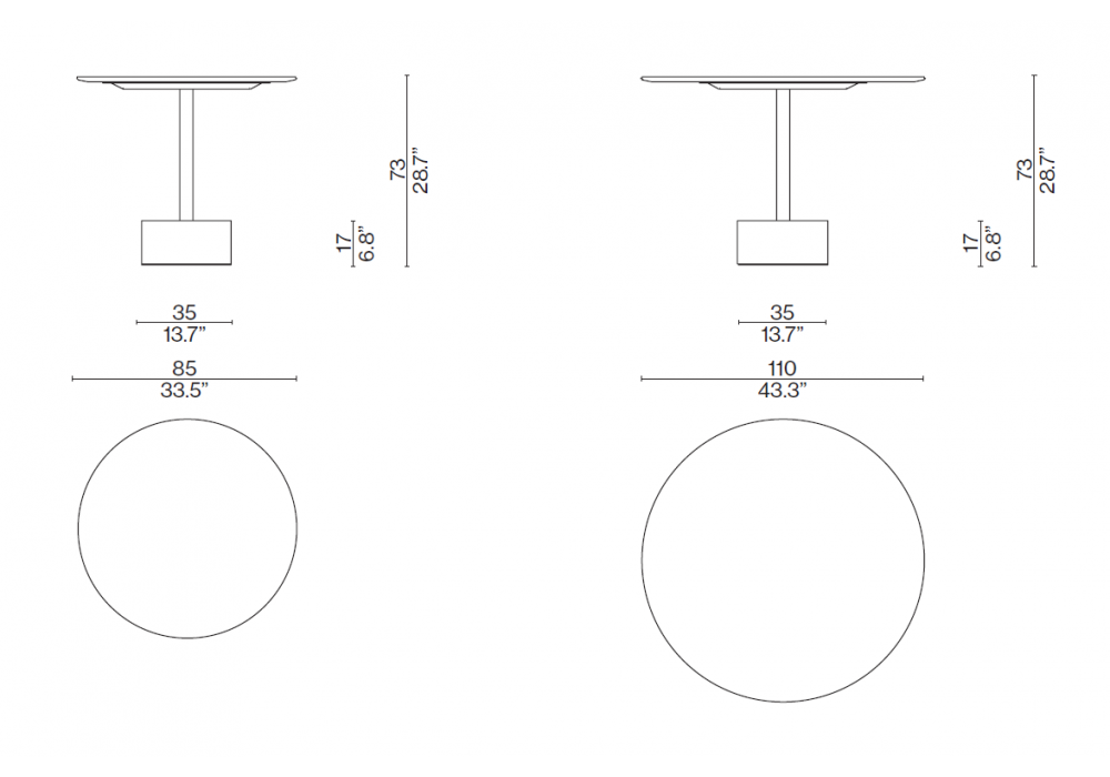 | Abmessungen | Ø 85 x H 73 cm; Ø110 x H 73 cm. |