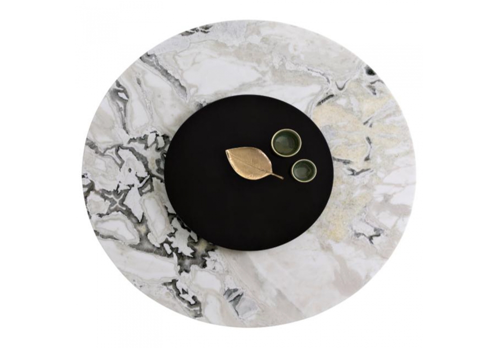 Otto von Carlotta Manzoni für Bodema entworfen, ist ein Esstisch mit MDF-Gestell, das in einer satinierten Messingfarbe lackiert ist, und einer Marmorplatte, die in verschiedenen Ausführungen erhältlich ist. Erhältlich in verschiedenen Größen und optional mit Lazy Susan.