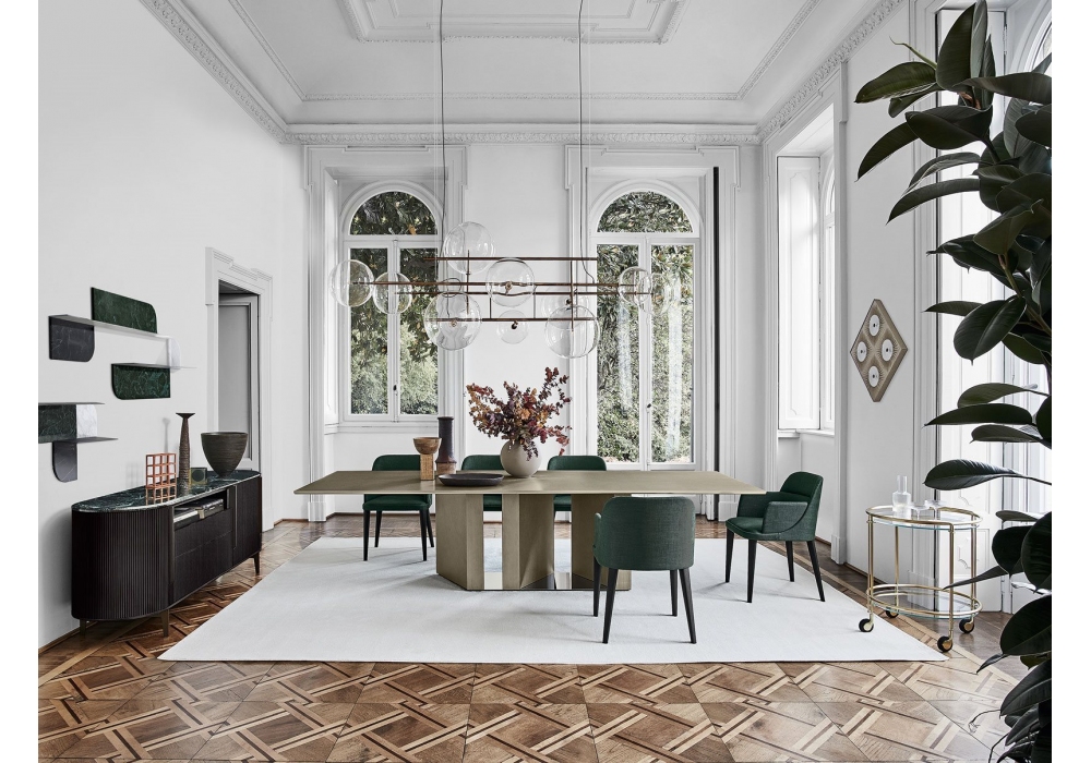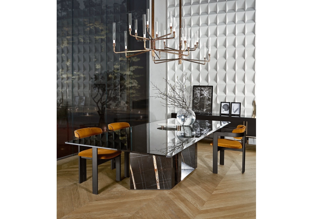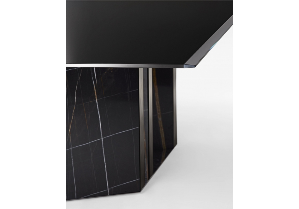 Platium von Oscar & Gabriele Buratti für Gallotti&Radice entworfen, ist ein Tisch mit Glasplatte 15mm schwarz. Lackierung jeweils hochglanz oder matt satiniert. Grosser Facettschliff von 4 ccm auf zwei längeren Plattenkanten. Gestell aus Holz mit Marmor Sahara Noir 20mm und Sockelplatte aus Edelstahl (Inox) "supermirror" poliert. Verfügbar auch mit Glasplatte 15mm und Holzgestell mit Glas 6mm in den Farben schwarz, blau grau oder schwarzbraun umkleidet. Lackierung jeweils hochglanz oder matt satiniert. Lieferbar auch in der gebürsteten Ausführung “Cashmere” in den Farben gold grey oder anthracite lackiert.