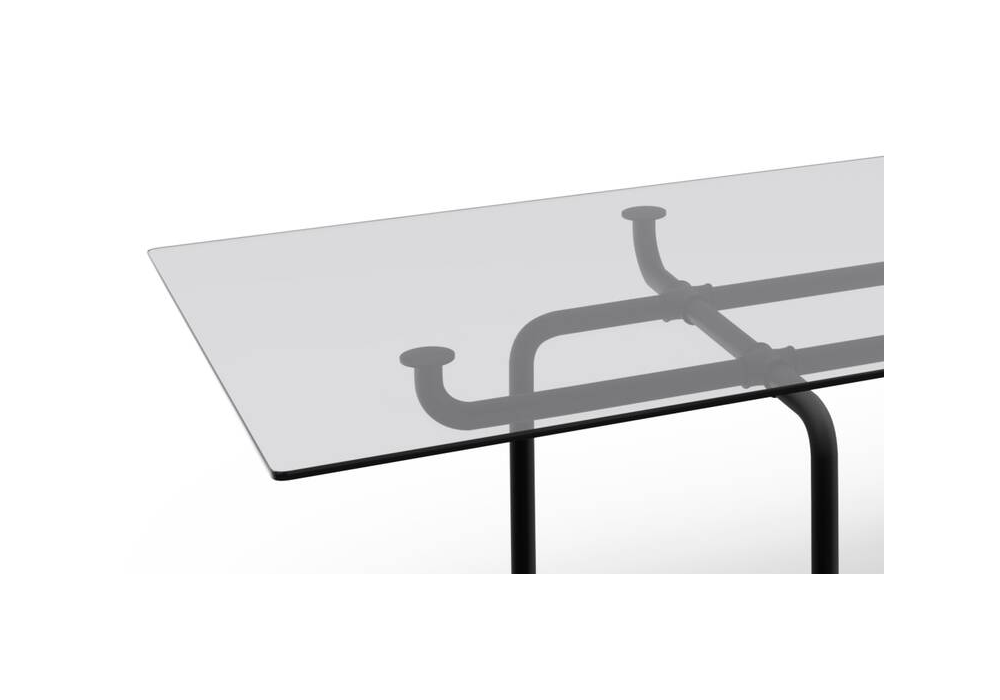 Edison von Vico Magistretti für Cassina entworfen, ist ein Tisch aus gehärtetem Floatglas. Struktur und obere Stütze in Stahl und ästhetische Verbindungen in Aluminiumguss schwarz lackiert oder Gänseschnabel orange. In verschiedenen Abmessungen erhältlich.