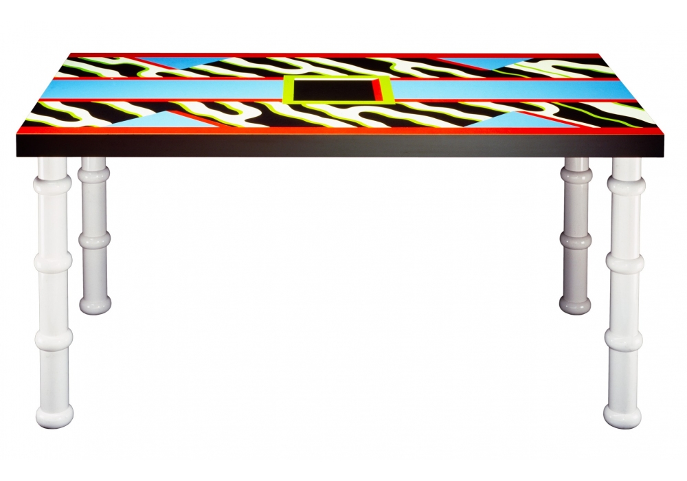 Madras von Nathalie Du Pasquier für Memphis Milano entworfen, ist ein Tisch mit einer verzierten Platte aus Kunststofflaminat.