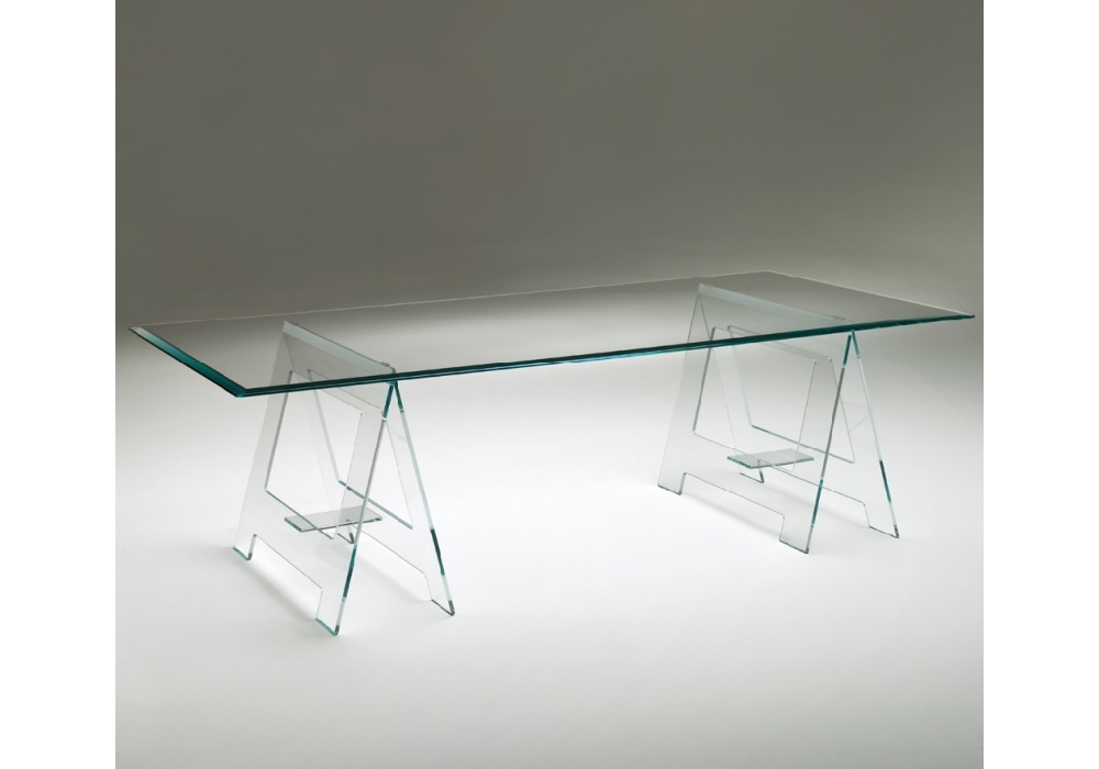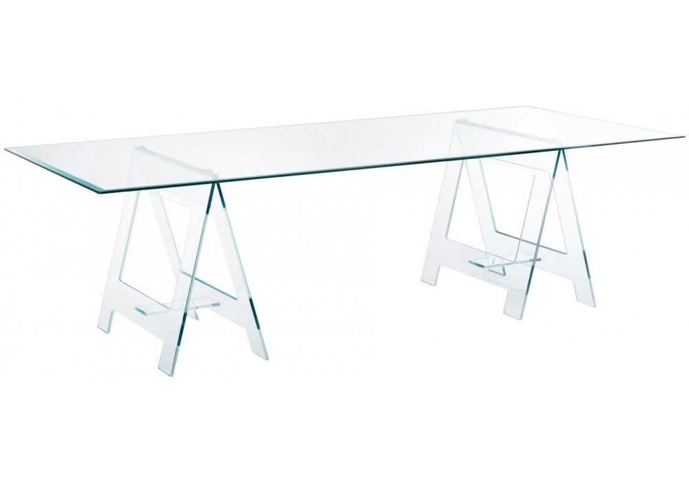 Don Cavalletto von Jean-Marie Massaud für Glas Italia entworfen, ist ein Tisch mit 12 mm extraleichter transparenter Glasplatte. biselDeutsch (deutsch) Seite und gehärtet, getragen von zwei Böcken aus gehärtetem und geklebtem transparentem Extralight-Glas. Erhältlich in verschiedenen Größen.