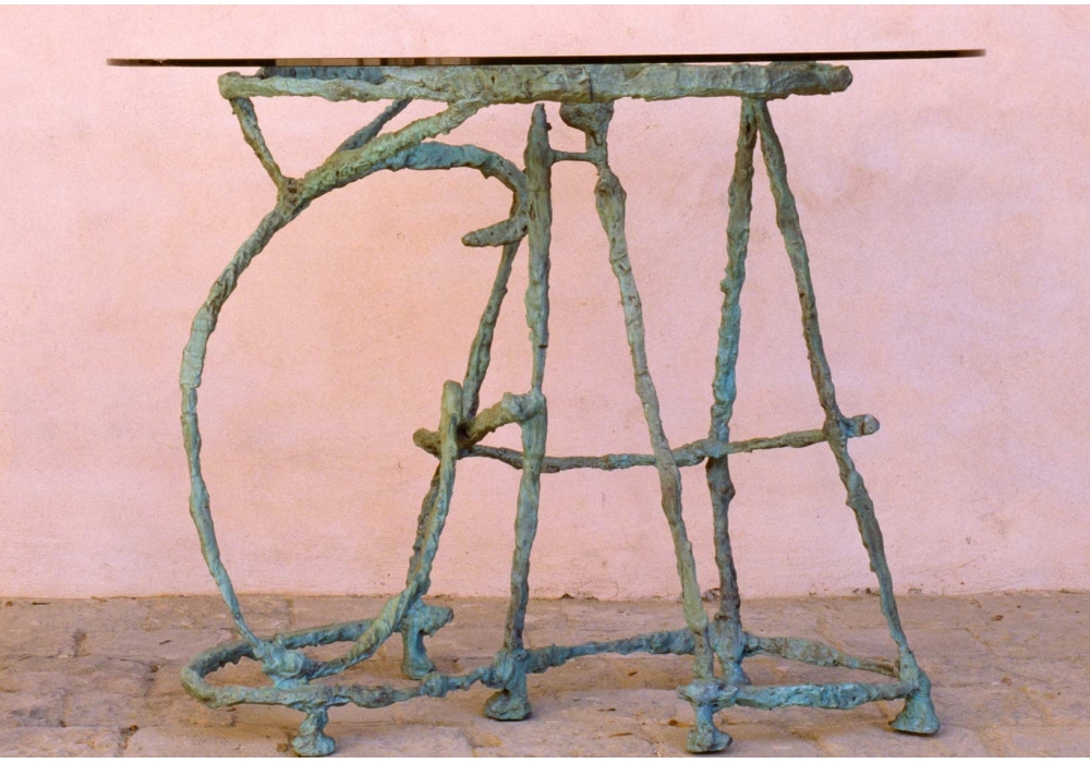 S. Chia von Sandro Chia für Memphis Milano entworfen, ist ein Tisch aus Bronze und Kristall. Limitierte Auflage von 25 Stück. Erhältlich in Bronze mit natürlicher oder grüner Patina.