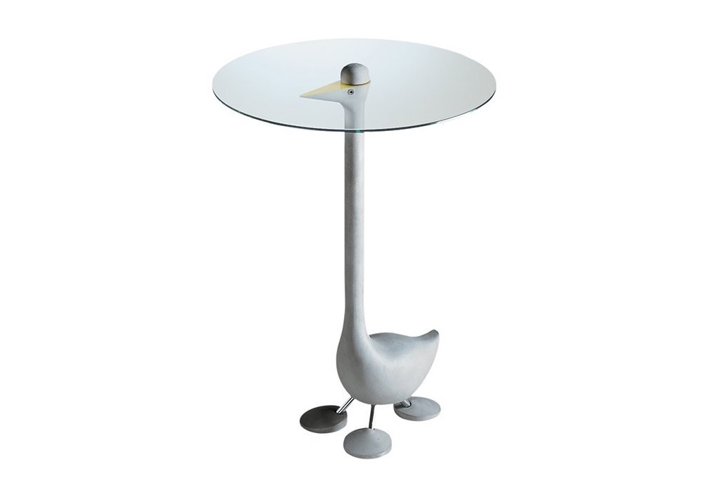 6520 Sirfo von Alessandro Mendini für Zanotta Edizioni entworfen, ist ein Tisch mit Struktur aus lackiertem Aluminiumguss, naturfarben mit gelb lackiertem "Schnabel". Platte aus gehärtetem Glas.