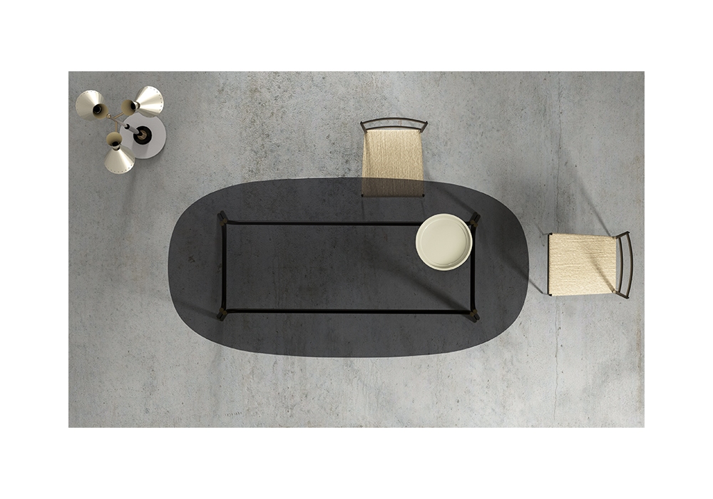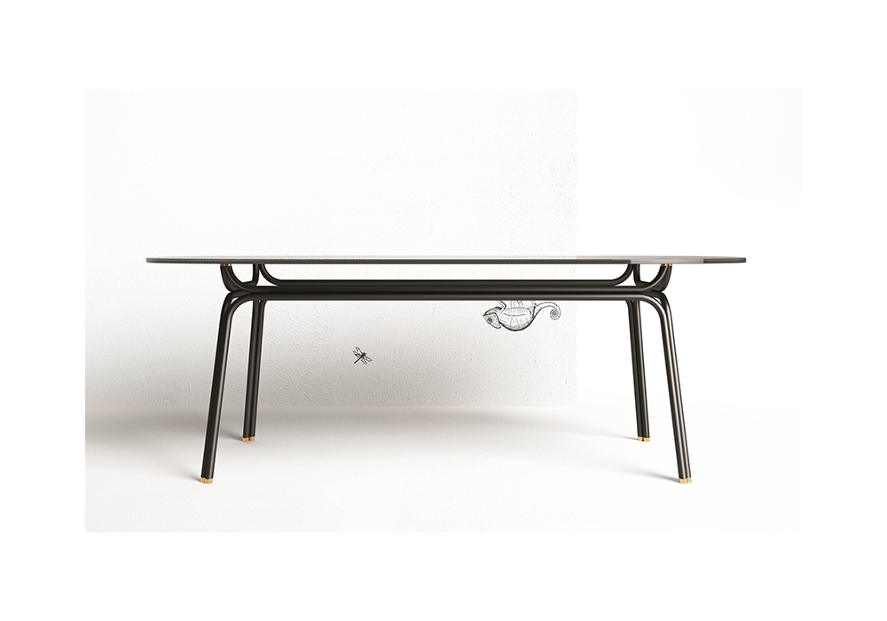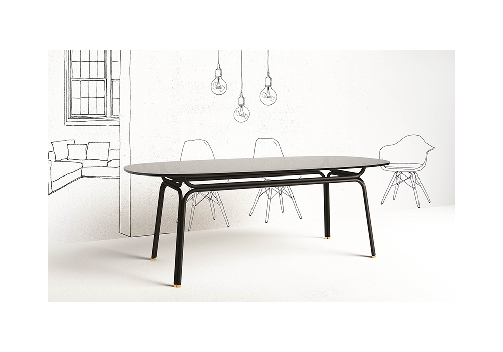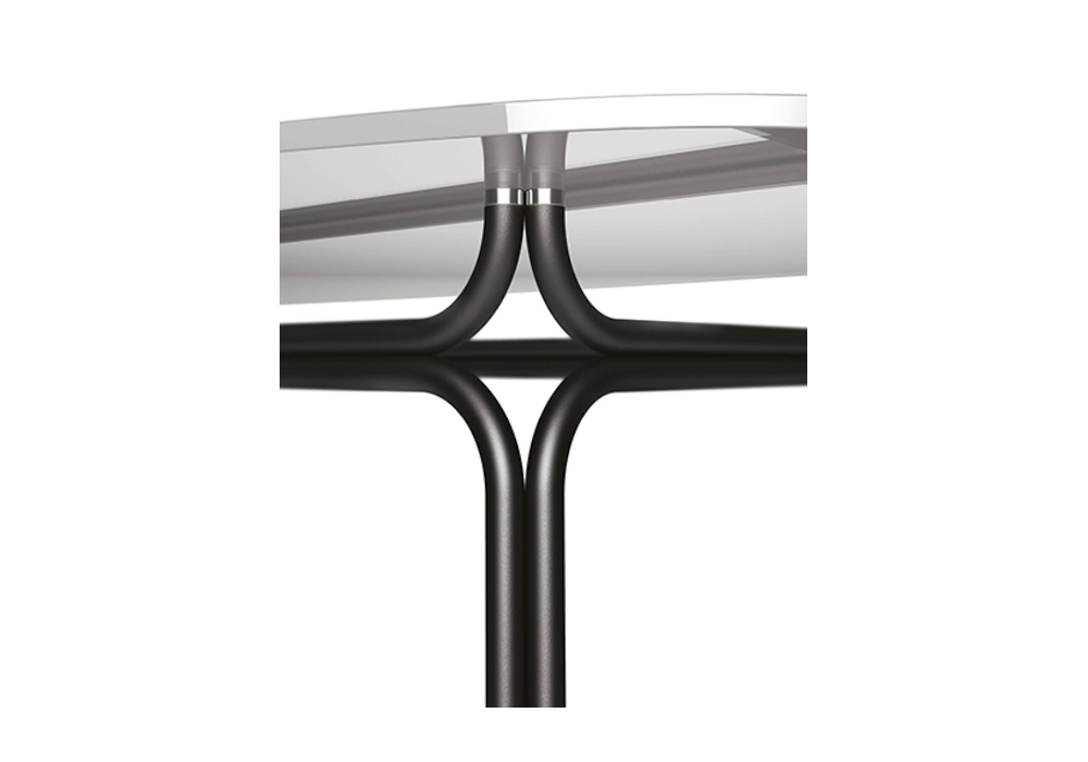 Tubi von Sebastiano Tosi für Minotti Italia entworfen, ist ein Tisch aus Eisenrohr, Gestell in schwarz matt, Spitzen aus poliertem Messing oder poliertem Nickel. Top erhältlich in extra klarem oder rauchgrauem Europaglas.