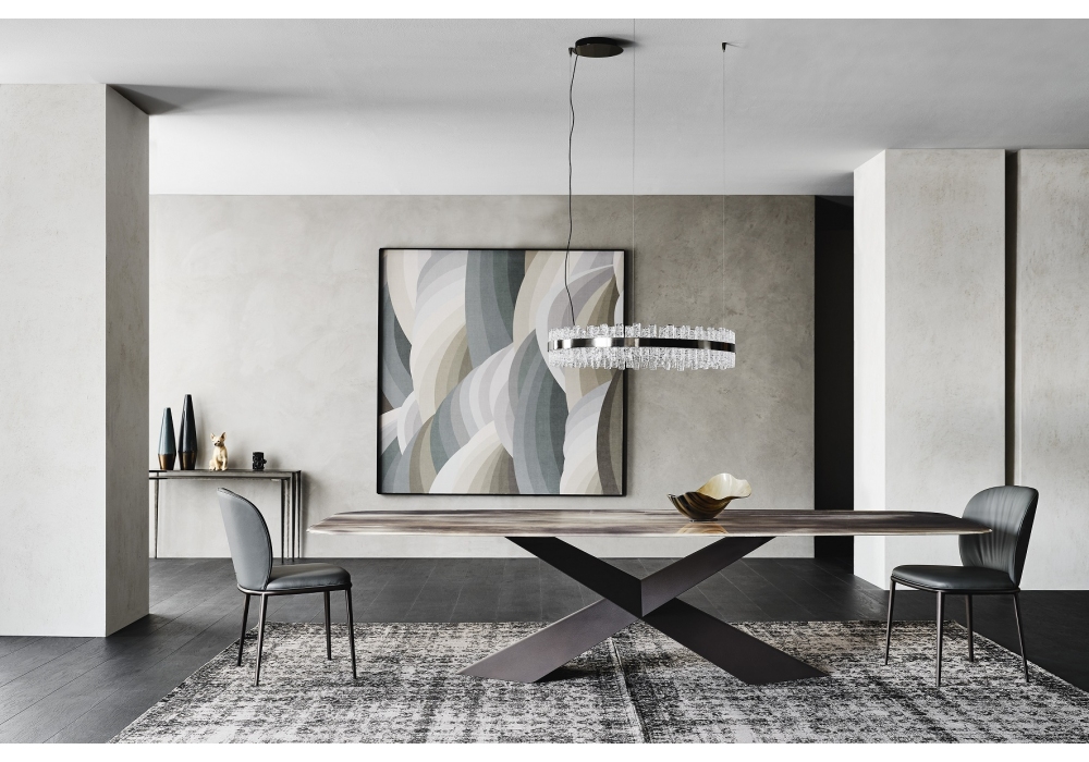 Tyron Crystalart von Paolo Cattelan für Cattelan Italia entworfen ist ein Tisch aus geprägtem lackiertem Stahlgestell. Glasplatte extra hell facettiert mit schmückendem Kunstdruck in zwei Farbvarianten. Erhältlich in mehreren Größen.