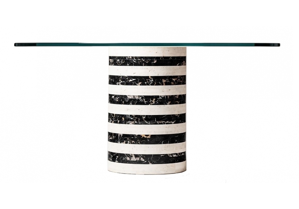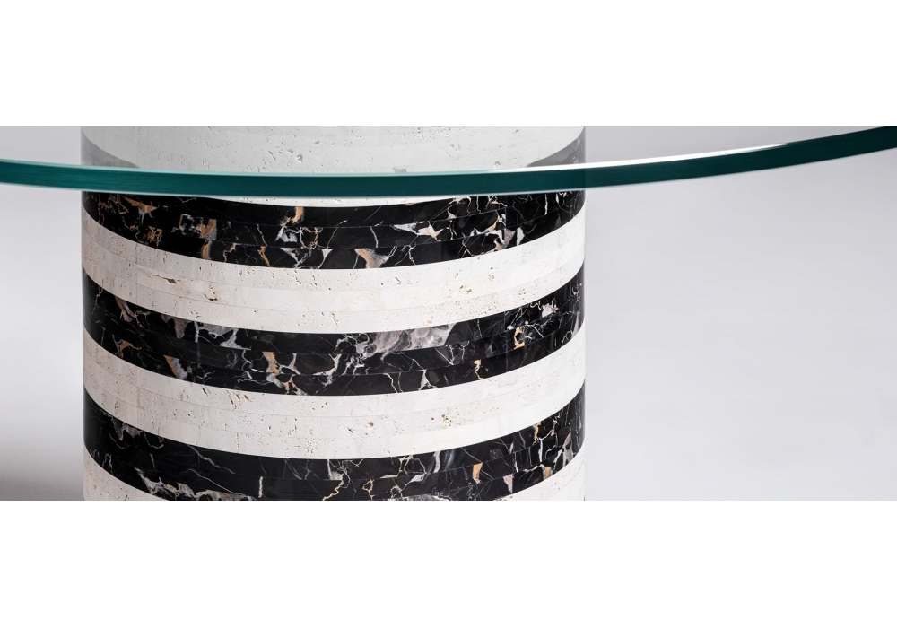 Architexture Living Table 02 von Patricia Urquiola für Budri entworfen, ist ein Tisch mit Mittelsäule aus Nero Portoro Marmor und offenporig sandgestrahltem Classic Travertin und Tischplatte aus extra klarem gehärtetem Glas.
