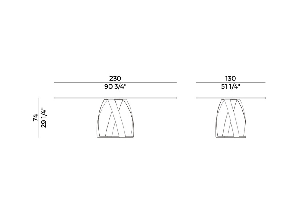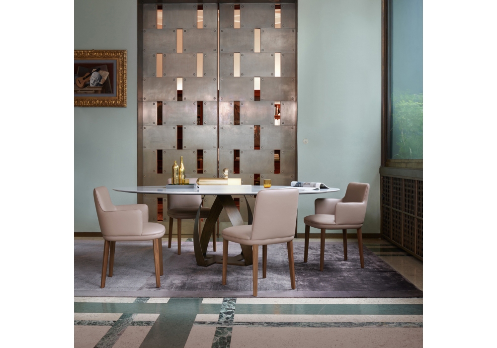 Bon Bon, von Alexander Lorenz für Potocco entworfen, ist ein Tisch mit Metallbasis in verschiedenen Farben lackiert. Die Platte hat eine ellipsenförmige Form und ist in Nussbaum Canaletto, Glas oder Marmor in verschiedenen Ausführungen und Größen erhältlich.