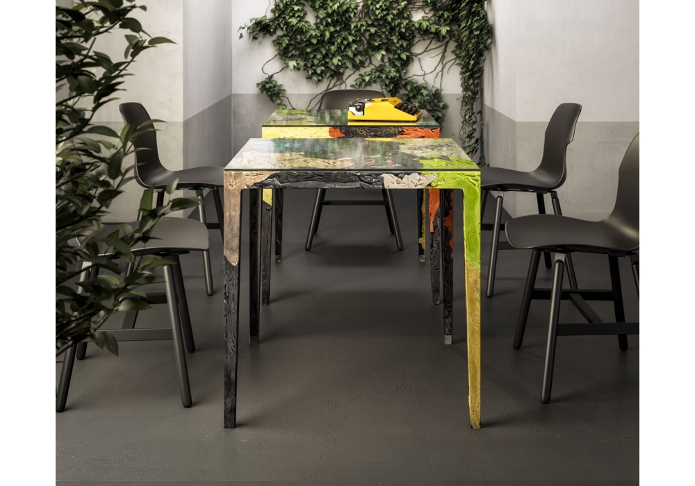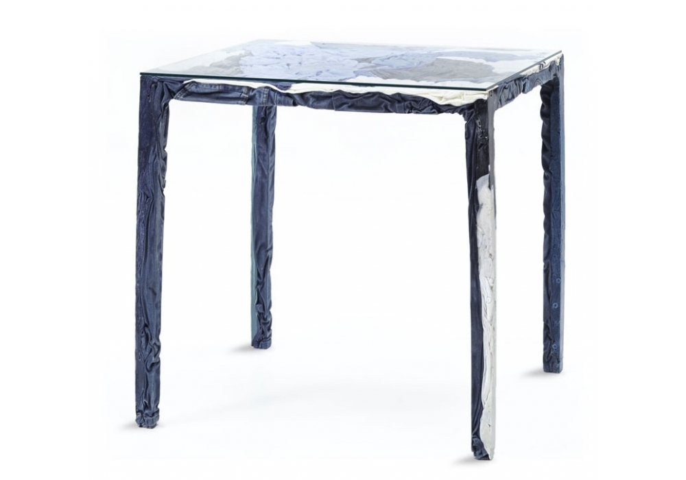 RememberMe Bistrot von Tobias Juretzek für Casamania & Horm entworfen, ist ein Tisch aus Schimmel, Mischen von Jeans oder Jeans und Baumwoll-T-Shirt, mit einem speziellen härtenden Harz pflanzlicher Natur. Obere Abdeckung aus extraklarem gehärtetem Glas.