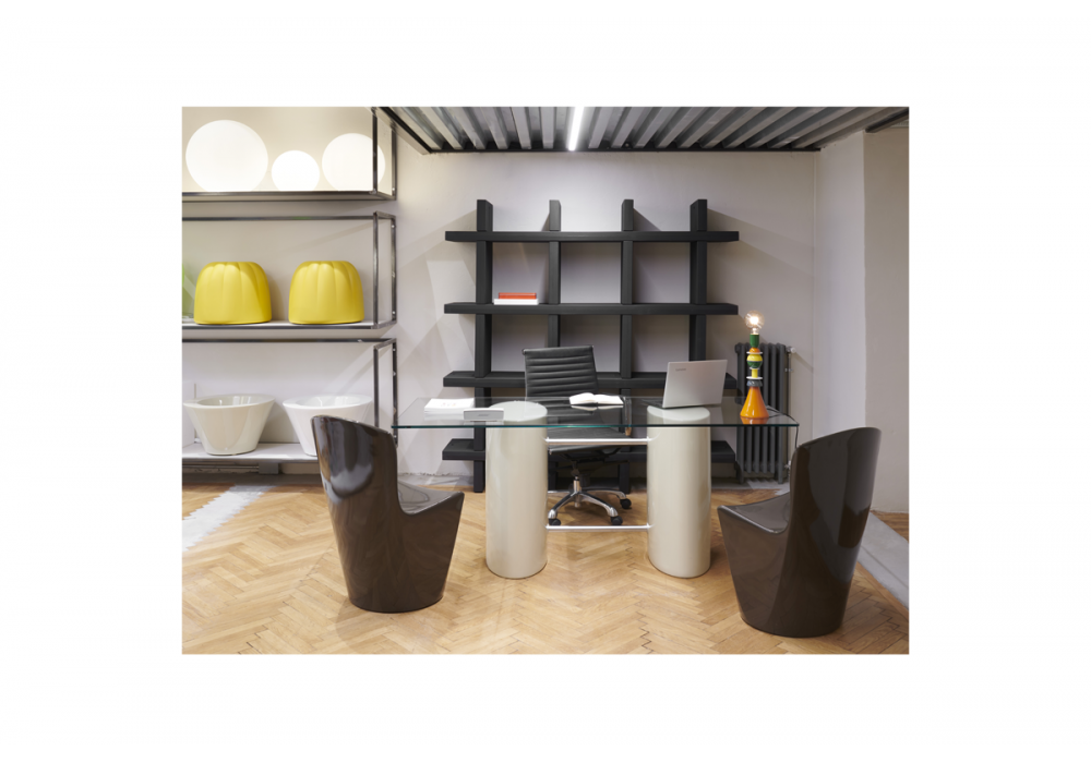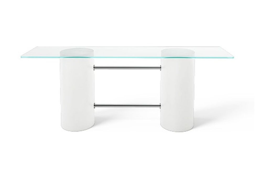 Winston, von Slide Studio für Slide entworfen, ist ein elliptischer Tisch mit einer rechteckigen Platte aus gehärtetem Glas. Das essentielle Design von Winston wird durch die Funktionalität der beiden horizontalen Aluminiumstangen ergänzt, die als Fußstützen dienen. Erhältlich in der hellweißen Version oder in verschiedenen Ausführungen