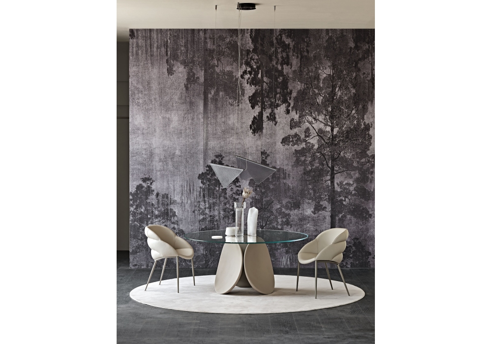Maxim, von Pio & Tito Toso für Cattelan Italia entworfen, ist ein runder Tisch mit Platte aus Glas und Undergestell aus handgespachteltem Ton.