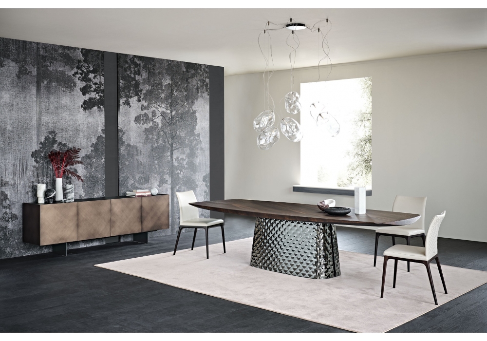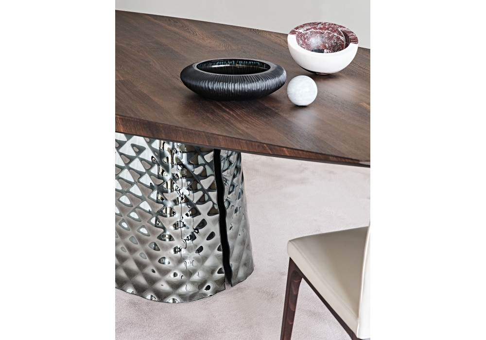 Atrium Wood von Paolo Cattelan & Lorenzo Remedi für Cattelan Italia entworfen, ist ein Tisch mit Platte aus Holz und Basis aus zwei fein gearbeiteten Kristallplatten, ein dreidimensionaler Effekt wie Steppen auf Stoff.