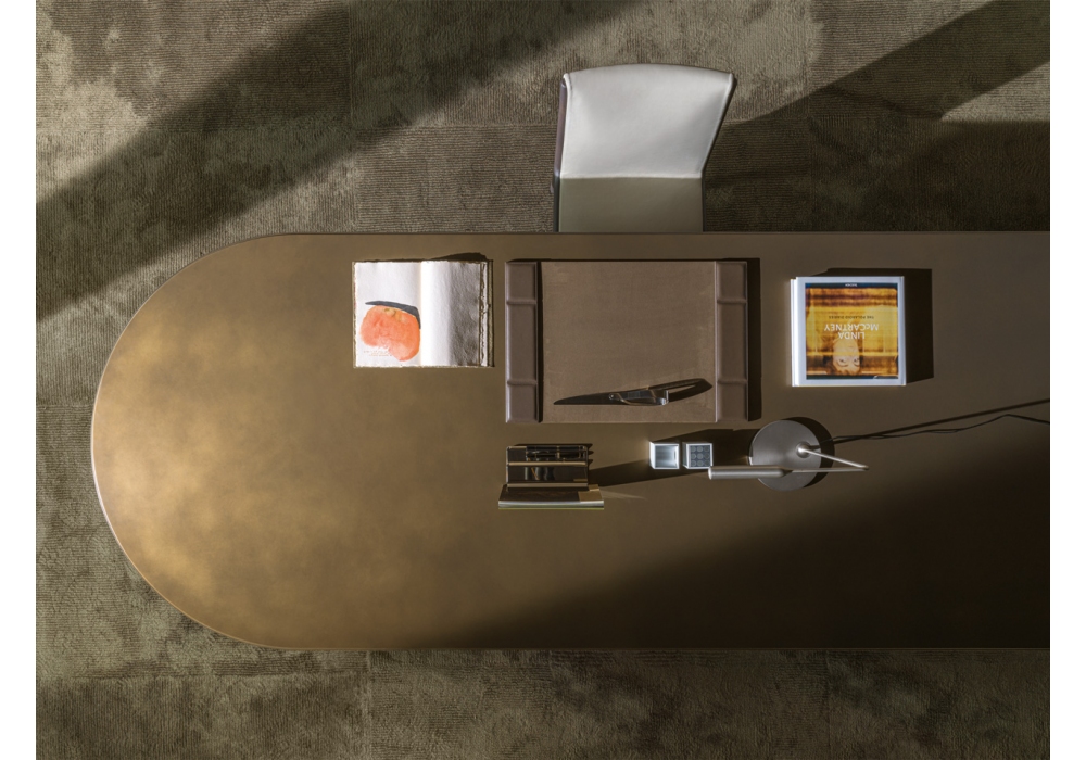 Blevio, von Ignazio Gardella für Molteni&C entworfen, ist ein Tisch mit Struktur und Platte aus mitteldichter Faserplatte, gebogen in der Form und lackiertem Eclipse-Finish. Auch mit Breccia Capraia-Marmorplatte mit Metallträgerstruktur erhältlich.