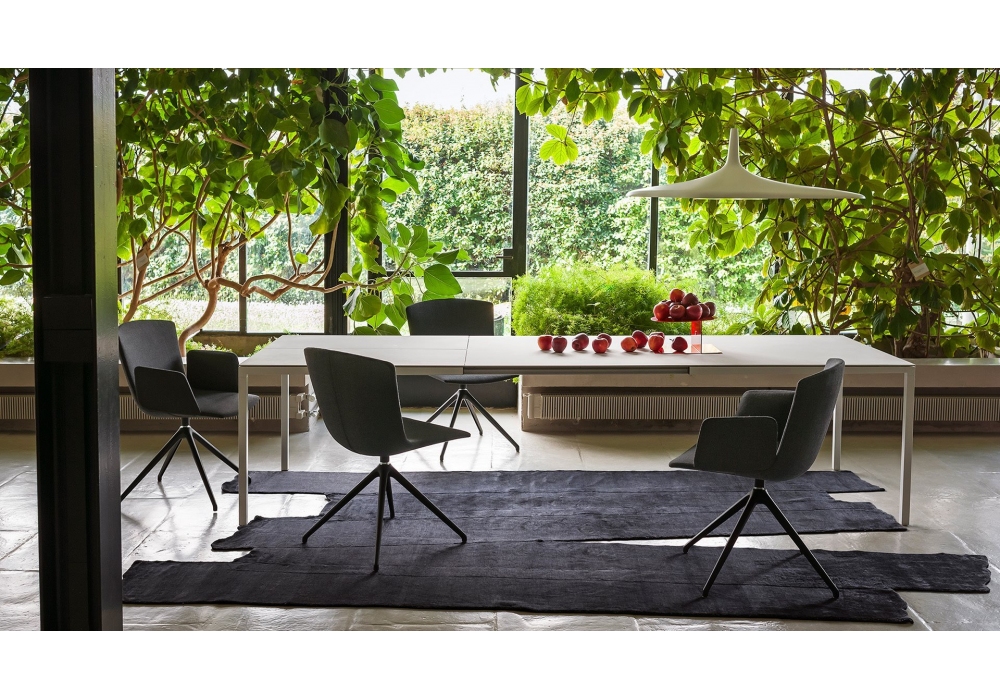 Helsinki 35 von Caronni & Bonanomi für Desalto entworfen, ist ein ausziehbarer Tisch mit abnehmbarer Stahlstruktur 35 x 35 mm Querschnitt und Druckgussgelenke. Struktur in Lackausführungen und Keramikplatten.