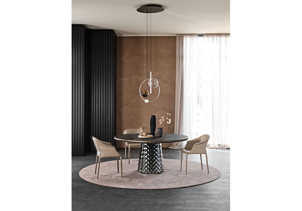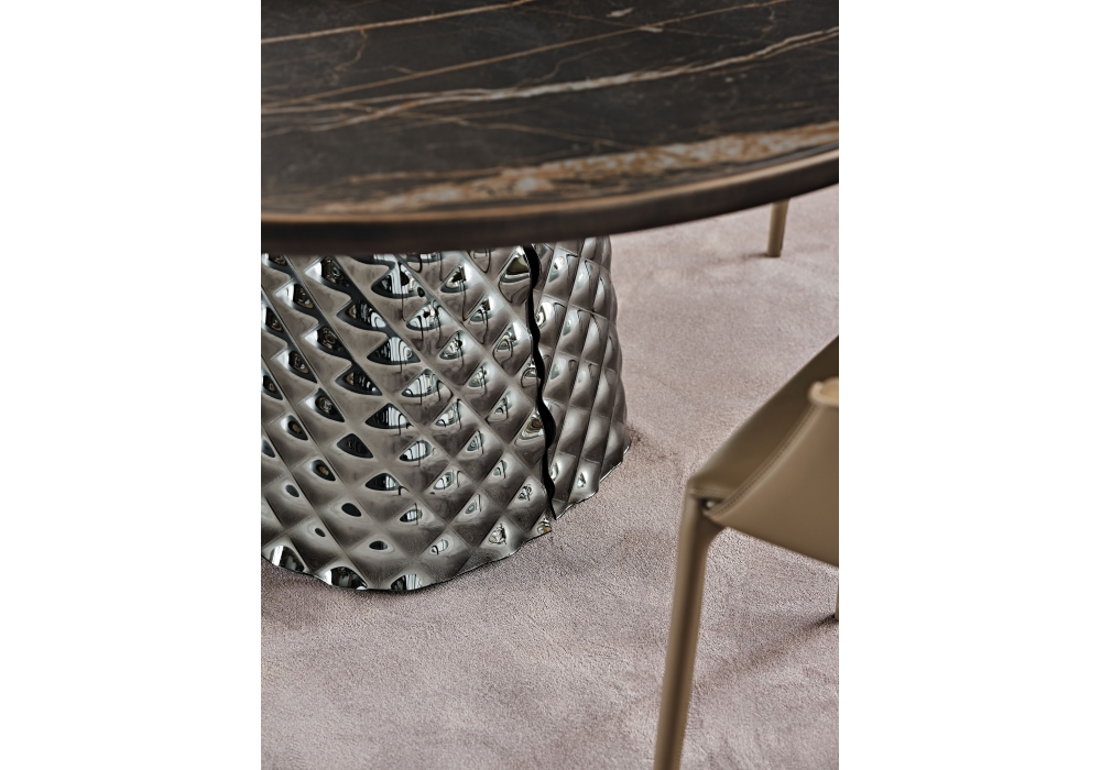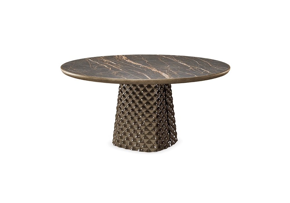 Atrium Keramik Premium Round von Paolo Cattelan & Lorenzo Remedi für Cattelan Italia entworfen, ist ein runden Tisch mit Platte aus Keramik Marmi in mehreren Farben mit Brushed Bronze oder Brushed Grey lackierten abgerundeten Profil. Undergestell aus zwei fein gearbeiteten Kristallplatten, ein dreidimensionaler Effekt wie Steppen auf Stoff.
