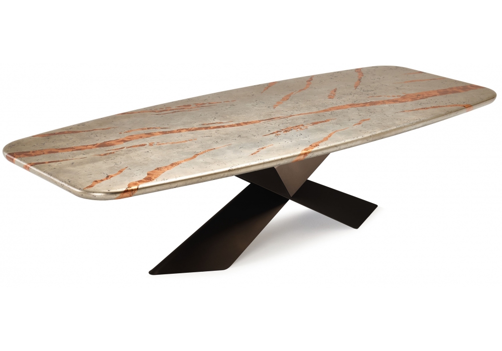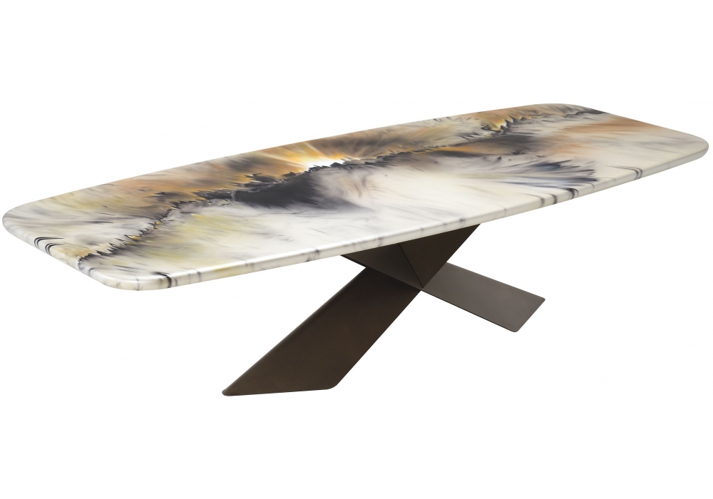Tyron Signature von Paolo Cattelan für Cattelan Italia entworfen, ist ein Tisch mit Platte aus MDF mit handgefertigter künstlerischer Zeichnung: Thunder in Silber und Kupfer Folie oder Goldeneye perlweiss spritzlackiert mit warmen Fabtönen. Sockel aus lackiertem Stahl. Jedes Esstisch ist einzigartig und nicht replizierbar.