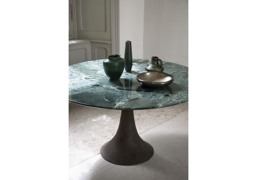 SK207 von Mangiarotti für AgapeCasa entworfen, ist ein runder Tisch mit zentraler Stütze aus Bronzeguss mit Wachsform, Oberfläche mit heiß aufgetragener Silbernitratpatina behandelt. Die Tischplatte besteht aus Marmor in verschiedenen Ausführungen.