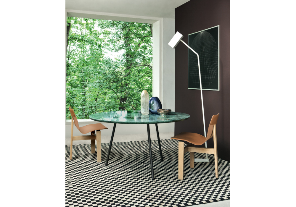 More von Mangiarotti entworfen und von Benedini Associati für AgapeCasa überarbeitet, ist ein Tisch in verschiedenen Formen, erhältlich in weißem Carrara-Marmor, grauem Carnico-Marmor, schwarzem Marquina-Marmor, grünem Alpi-Marmor, dunklem Emperador-Marmor oder aus Sperrholz mit natürlicher oder brauner Eichenoberfläche. dunkel. Die Beine aus Edelstahl sind in gebürsteter oder gebürsteter brünierter Ausführung erhältlich.