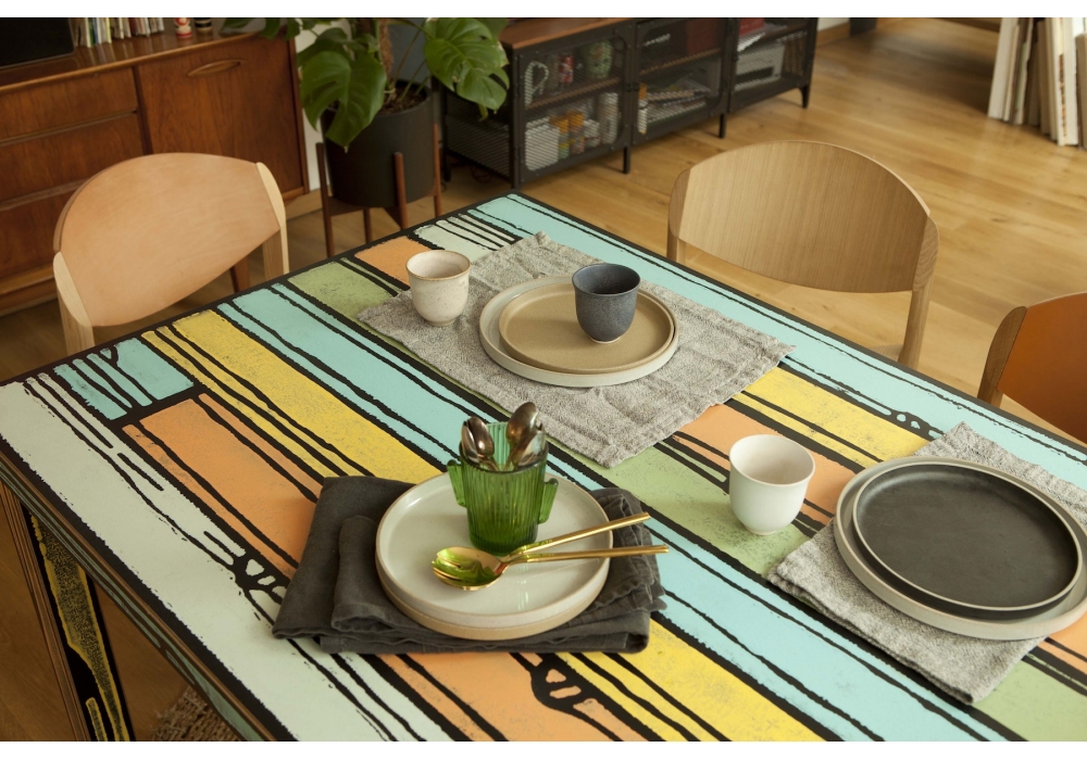Wrongwoods von Richard Woods & Sebastian Wrong für Established & Sons entworfen, ist ein Holztisch mit Blockdrucken auf der Holzmaserung.