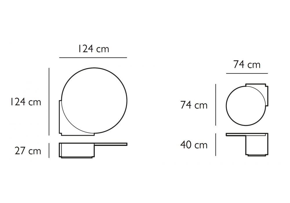 | Abmessungen | Ø 74 x H 40 cm; Ø 124 x H 27 cm. |
