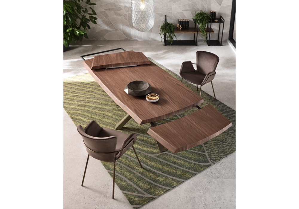 Shangai von Riflessi entworfen, ist ein Tisch mit einer 50 mm dicken Holzplatte. mit unregelmäßigen Kanten in Nussbaum Canaletto oder Eiche. Untergestell aus Aluminium mit verspiegeltem Edelstahl, lackiert, mit Sandstein Rivergrey oder ArabiK oder mit Nussbaum Canaletto oder Eiche. Verfügbar in mehreren Abmessungen.