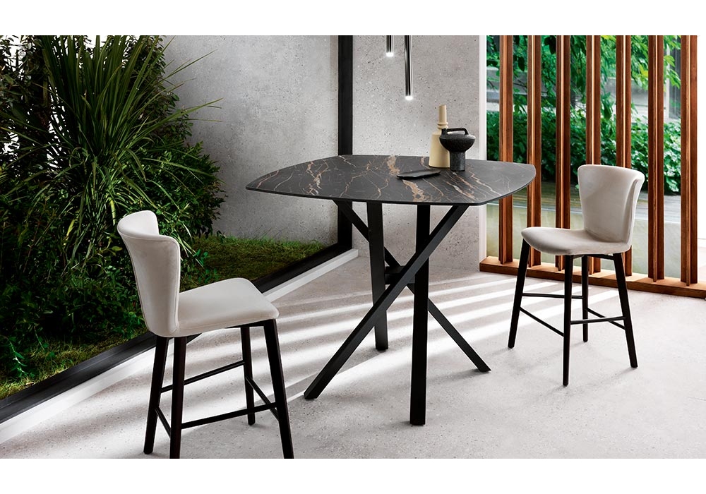Shangai von Riflessi entworfen, ist ein Snack-Tisch mit geschichteter abgeschrägter Keramikplatte auf Glas und lackiertem Aluminiumsockel. Verfügbar in mehreren Abmessungen.