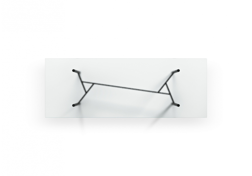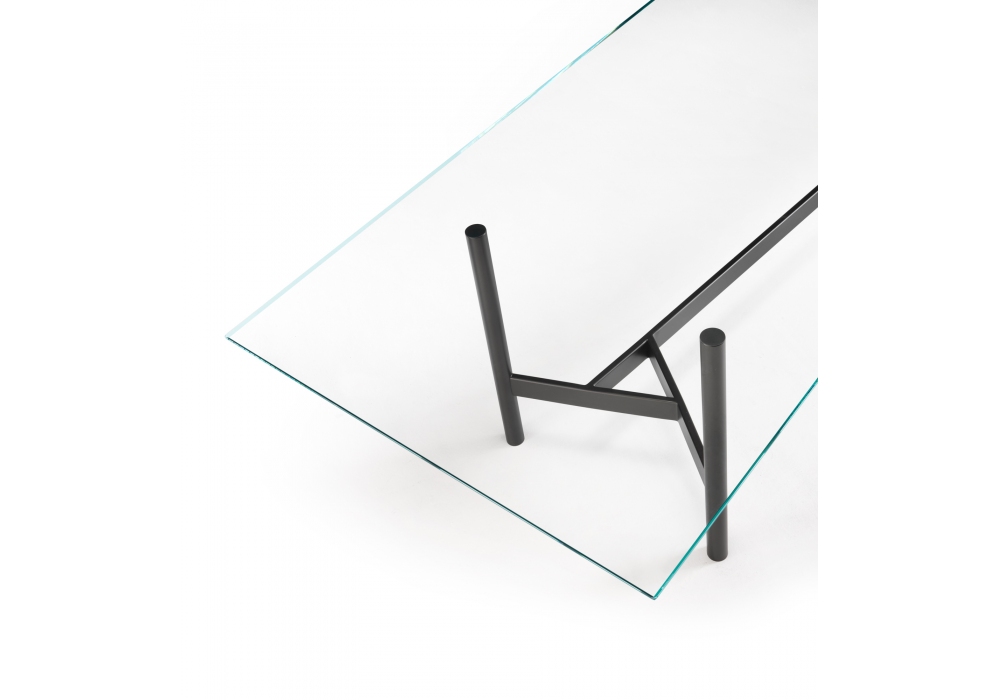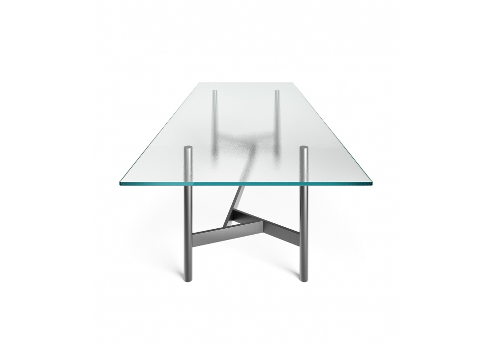 Agos von Ludovica + Roberto Palomba für Fiam entworfen, ist ein Tisch mit einem Untergestell aus lackiertem Metall und einer Platte aus extraleichtem geschmolzenem, gehärtetem oder geschichtetem und bisselliertem Bronze- oder Rauchglas.