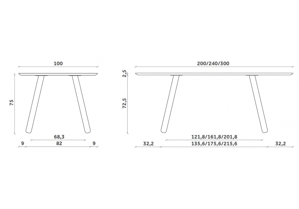 | Abmessungen | • Ø 130 x H 76 cm; • Ø 150 x H 75 cm; • 200 x 100 x H 76 cm; • 240 x 100 x H 76 cm; • 300 x 100 x H 76 cm |