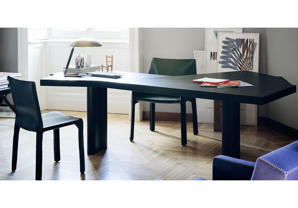 511 Ventaglio von Charlotte Perriand für Cassina entworfen, ist ein Tisch mit einer Platte aus Spanplatte und MDF-Platte mit Eichenfurnier mit Kanten aus massiver Eiche und Beinen aus Massivholz.