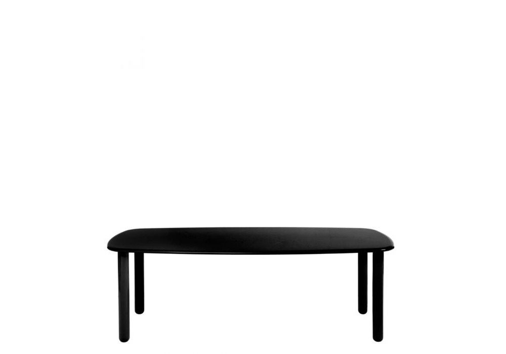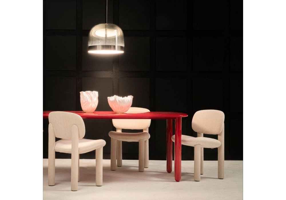 Tottori, von Kateryna Sokolova für Driade entworfen, ist ein Tisch mit Platte aus MDF mit "seifenförmiger" Kante und abgerundeten Ecken, Beinen aus Massivholz, wobei der Teil auf dem Boden ruht, in einer Halbkugel abgerundet, Stahlstruktur, rot glänzend lackiertes Finish Rubin. Nur für den internen Gebrauch.