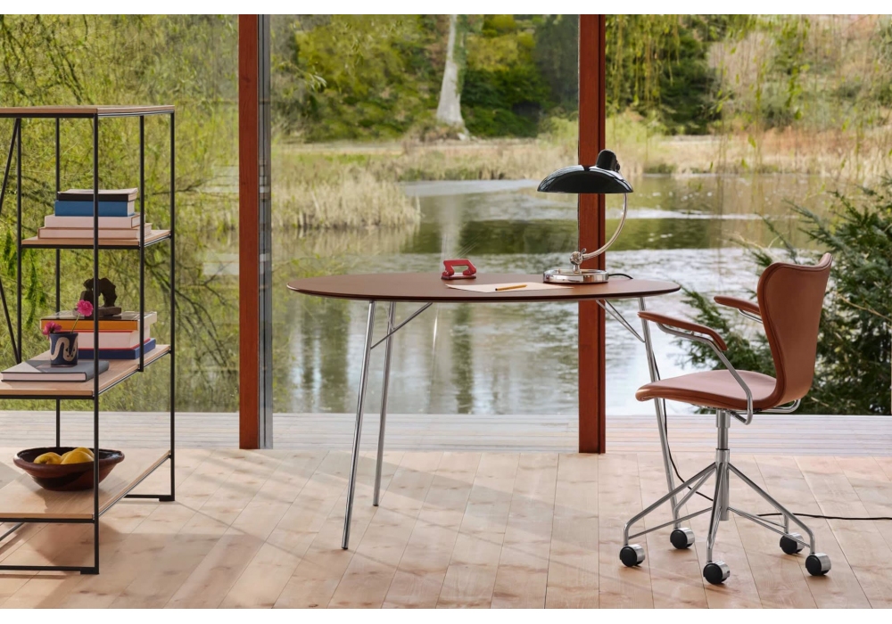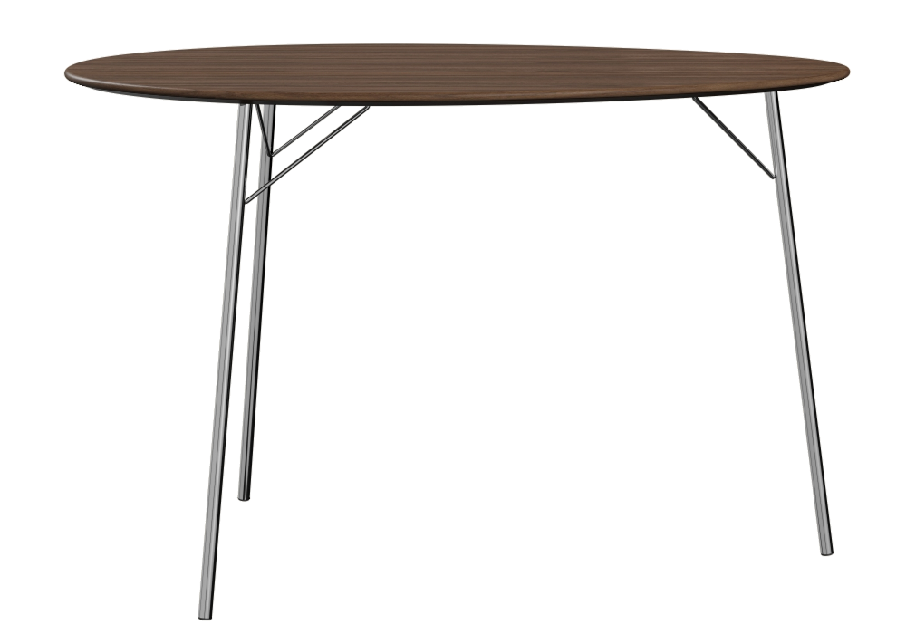 Egg™ Table von Arne Jacobsen für Fritz Hansen entworfen, ist ein Tisch mit furnierter Platte aus FSC-zertifiziertem Nussbaum. Basis mit drei Beinen aus verchromtem Stahl. In zwei Höhen erhältlich.
