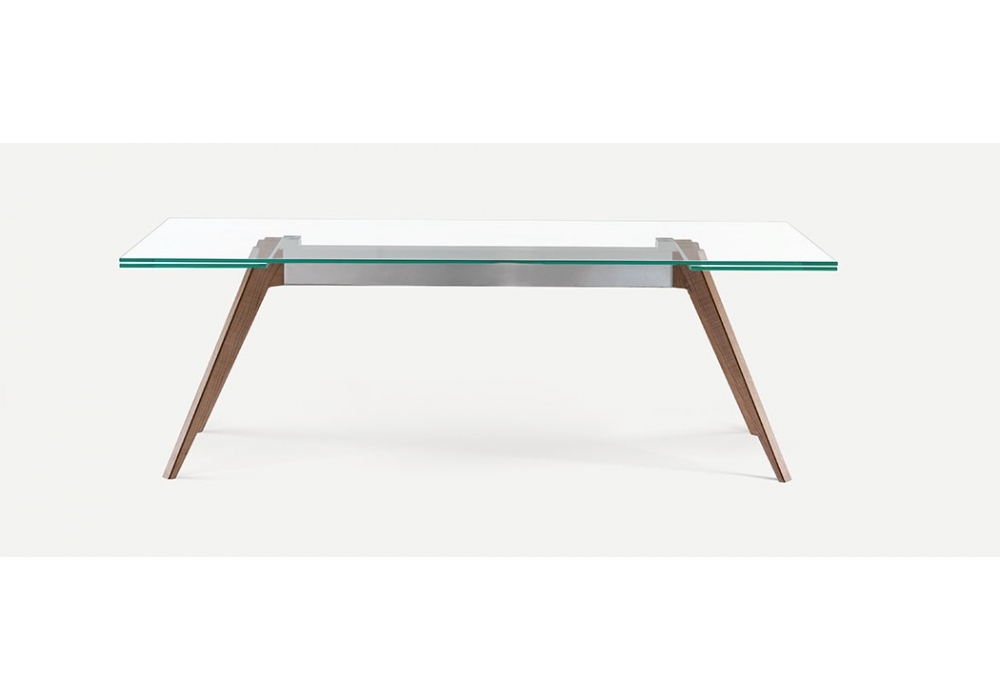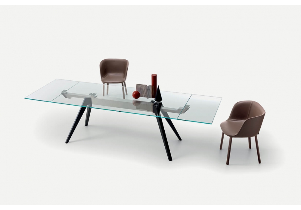 Delta von Pianca entworfen, ist ein Tisch mit Beinen aus massiver Esche lackiert Essenza, aus matt lackierter massiver Buche oder aus glänzend verchromtem Metall. Platte und Verlängerungen aus transparentem Silberglas. Verfügbar in mehreren Ausführungen und Abmessungen.
