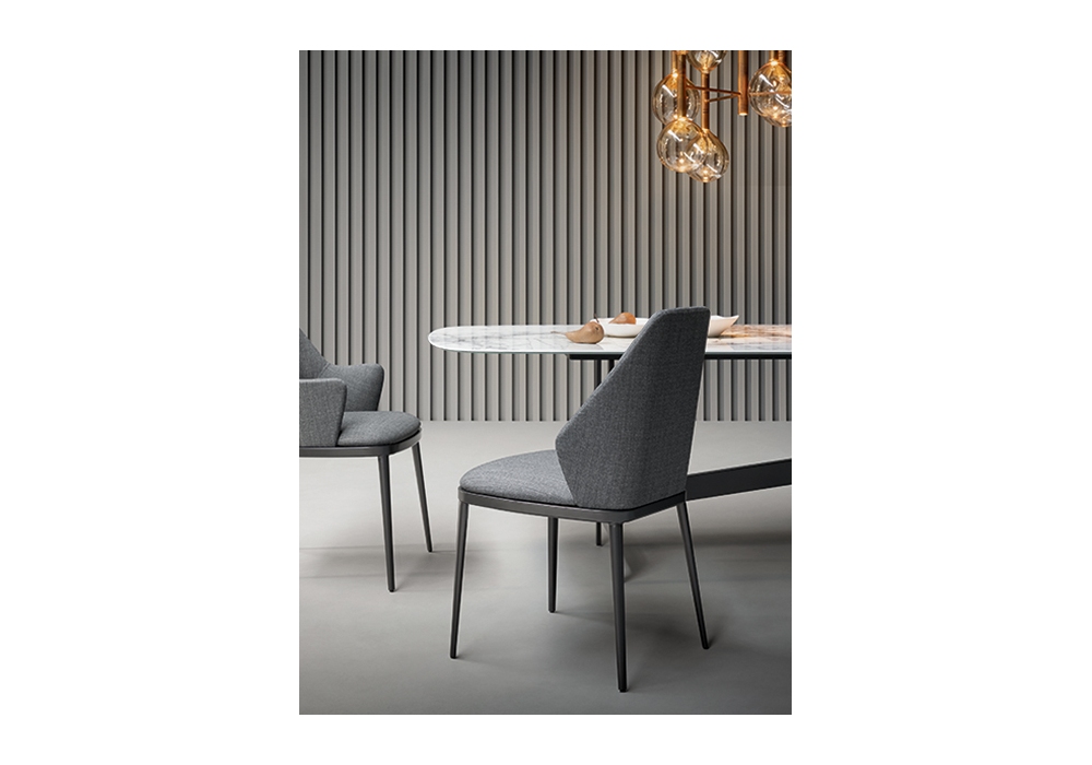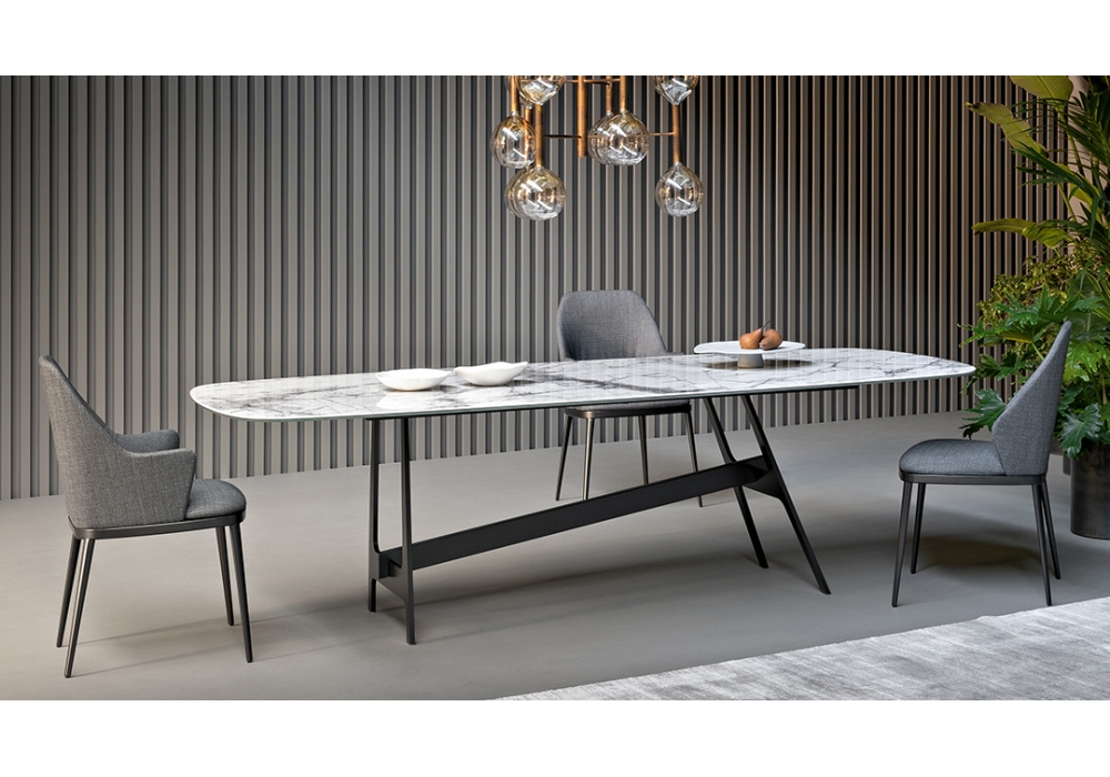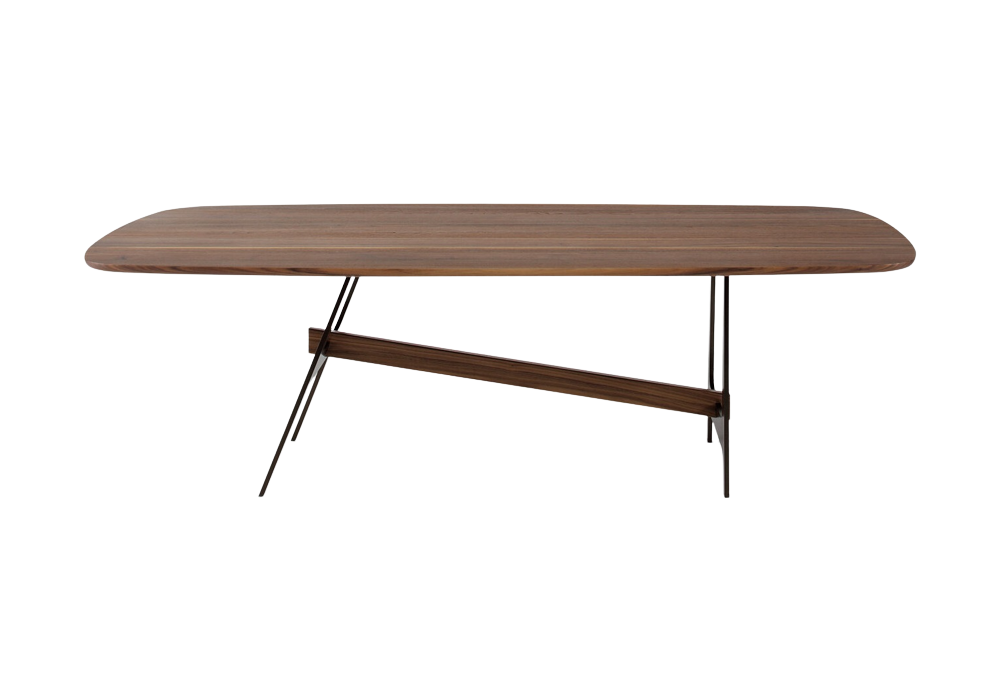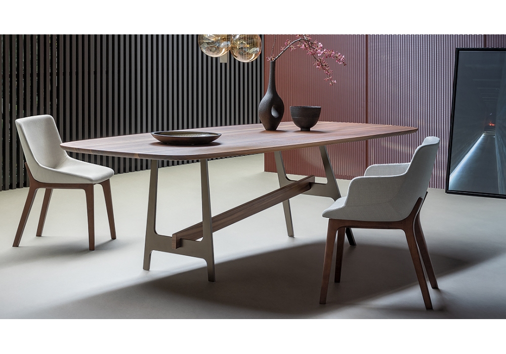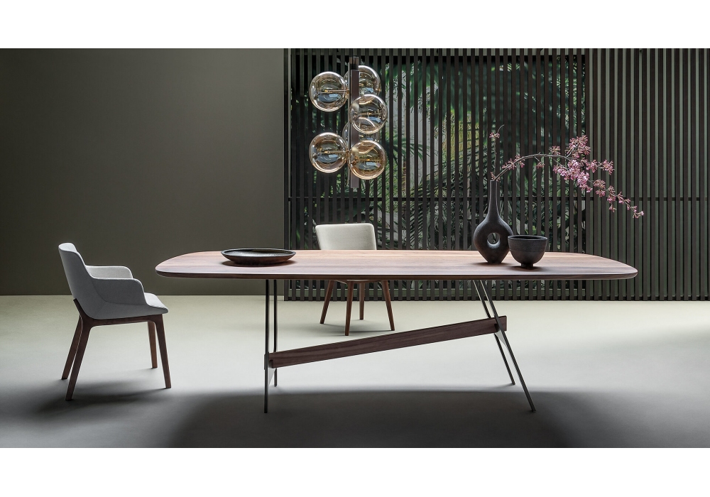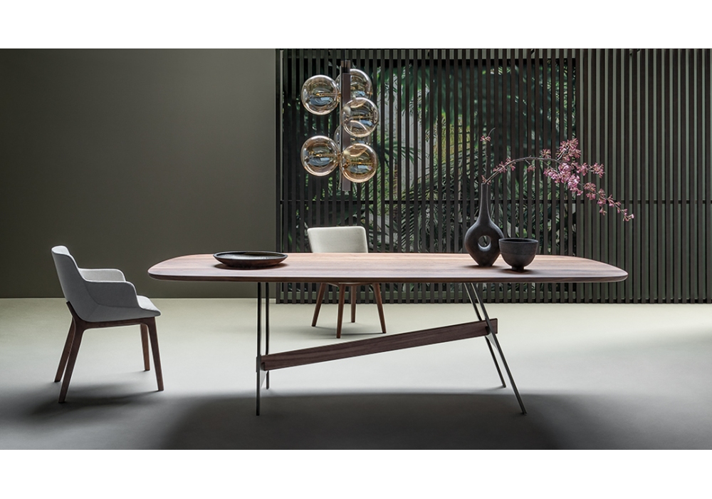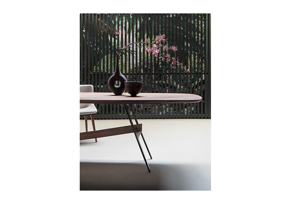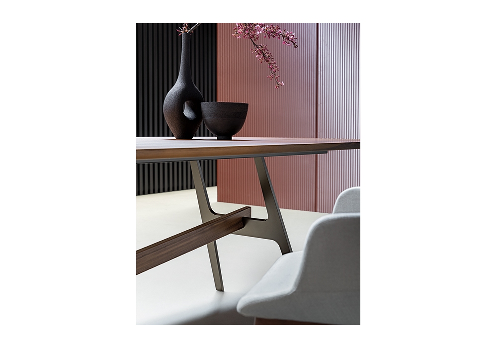 Slot, von Giuseppe Viganò für Bonaldo entworfen, ist ein Tisch, der in verschiedenen Größen erhältlich ist, mit Basis und Mittelbalken aus lackiertem Metall und Platte aus verschiedenen Materialien und Farben. Der zentrale Balken kann aus Metall in der gleichen Ausführung wie der Sockel oder aus Canaletto-Nussbaum sein.