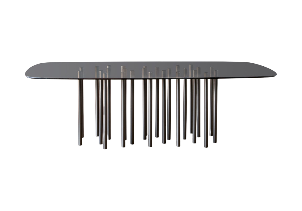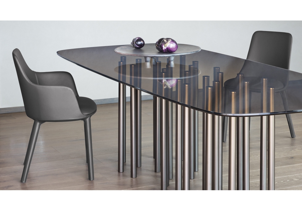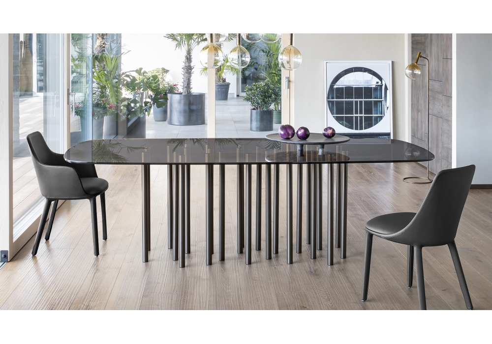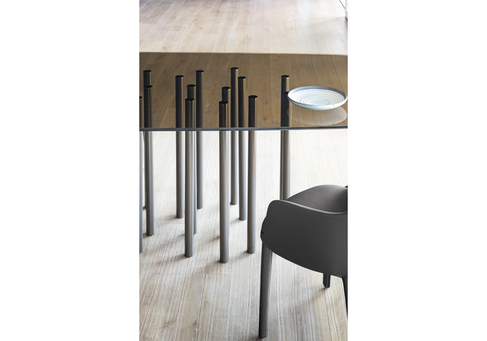Mille, von Bartoli Design für Bonaldo entworfen, ist ein Tisch mit Fassplatte aus Kristall und Struktur aus lackiertem Metall, in 3 Farbkombinationen. Erhältlich in verschiedenen Größen.
