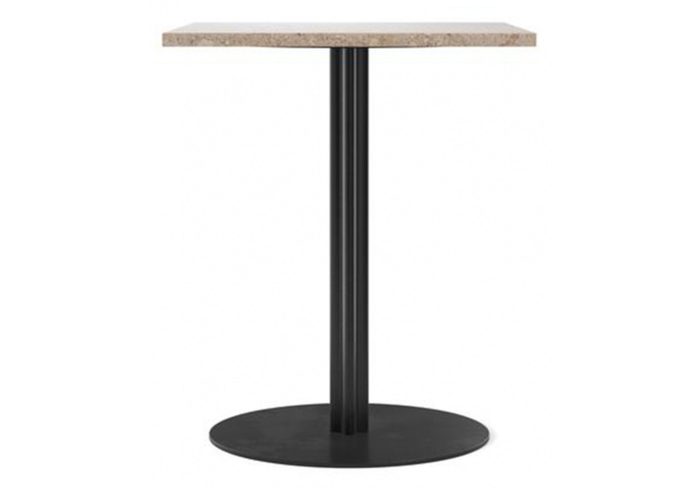 Harbour Column von Norm Architects für Audo Copenhagen entworfen, ist ein rechteckiger Tisch mit Basis aus Aluminium und schwarz pulverbeschichtetem Stahl, Platte aus Kunis Breccia-Stein, Estremoz-Marmor, schwarz gebeizter Eiche oder Linoleum. In verschiedenen Höhen erhältlich.