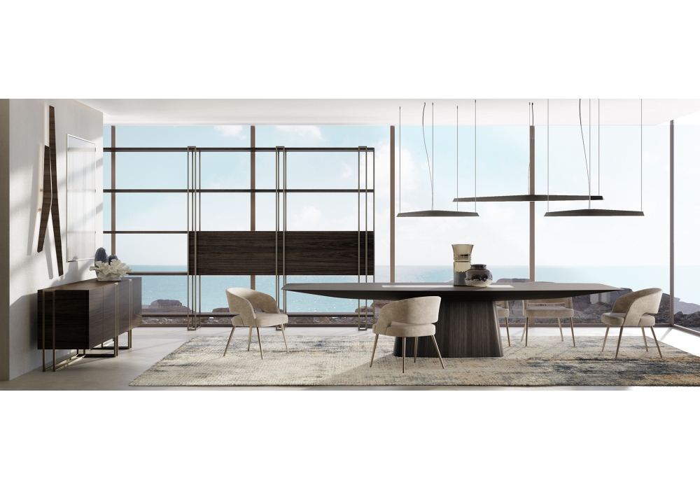 Evan, von Emmemobili entworfen, ist ein Tisch aus furniertem oder lackiertem Sperrholz, mit tonnenförmiger Platte, glatt oder mit einem Einsatz aus natursatiniertem oder brüniertem handgebürstetem Messing verziert. Erhältlich in drei Größen und in verschiedenen Ausführungen.