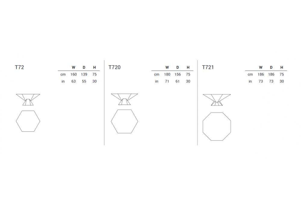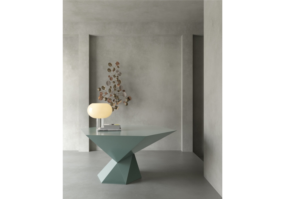 Fresko, von Evgenij V. Poliantsev für Emmemobili entworfen, ist ein Tisch mit facettierter Platte und Basis in sechseckiger oder achteckiger Form. Aus furniertem oder lackiertem Sperrholz. Erhältlich in verschiedenen Größen und in verschiedenen Ausführungen.