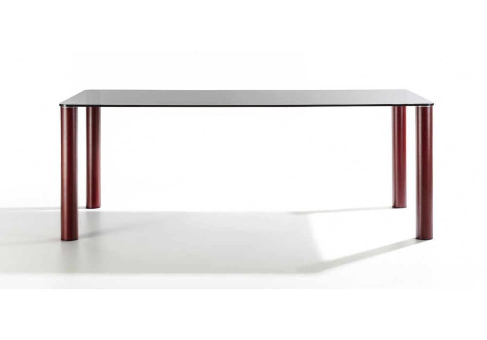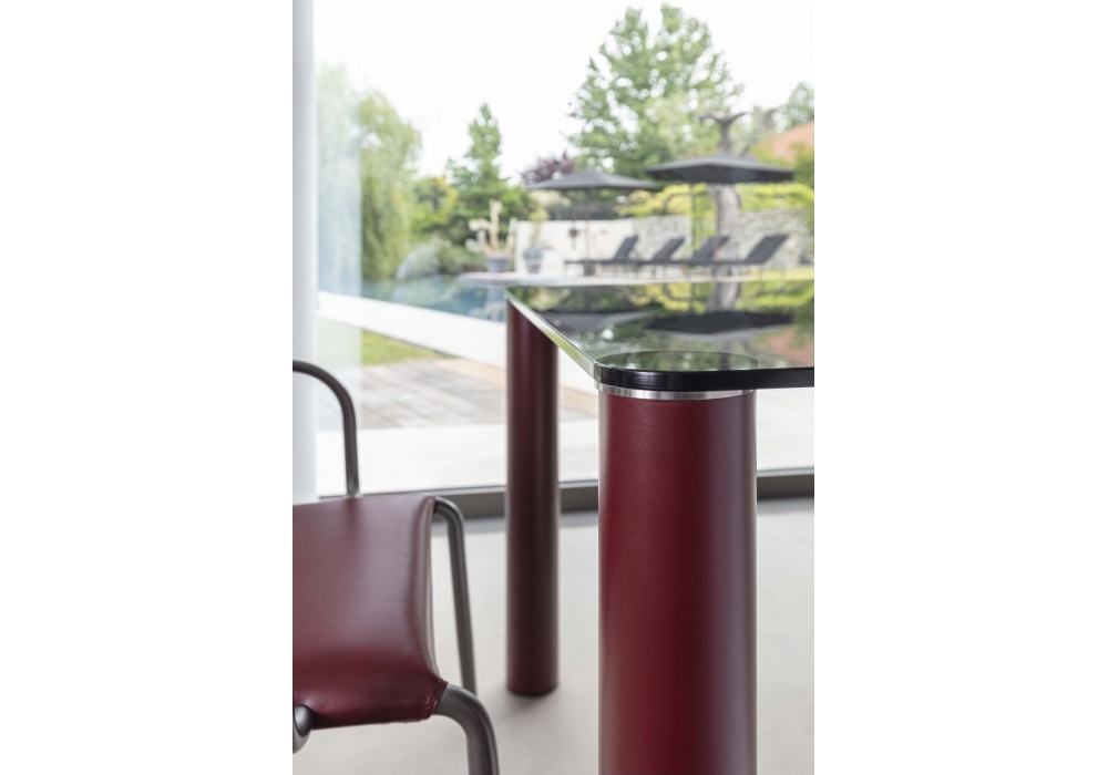 Fagus von RedCreative für Enrico Pellizzoni entworfen, ist ein Tisch mit lederbezogenen Stahlbeinen. 12 mm Kristallplatte. Erhältlich in verschiedenen Ausführungen und Größen.