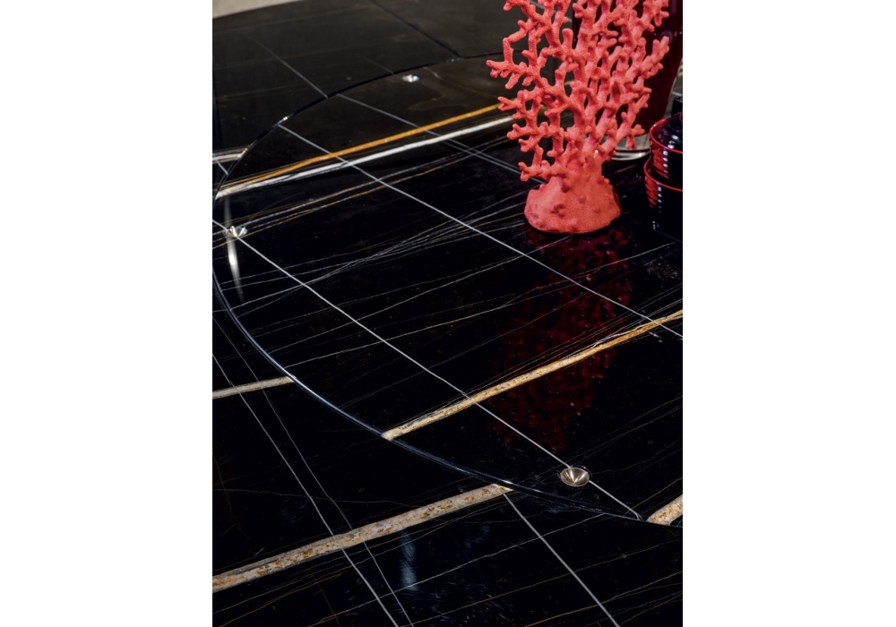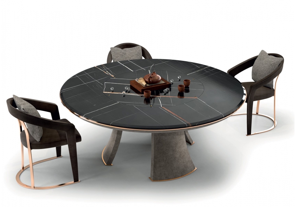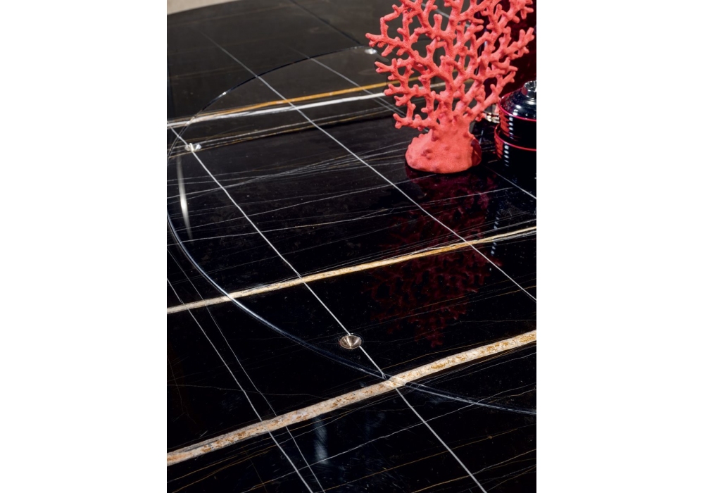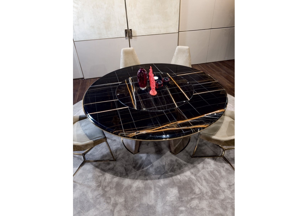Damien Round von Giuseppe Viganò für Longhi entworfen, ist ein runder Tisch mit dreibeinigem Untergestell aus hochdichtem Strukturschaumstoff und mit Leder bezogen. Metallteile mit glänzender oder matter Oberfläche und Marmor- oder Spiegelplatte mit eingelassenem Drehgelenk; Metallnieten in die Oberseite eingelassen. Möglichkeit, einen elektrischen Linearantrieb einzusetzen, der den Drehtisch bewegt, um Reinigung und Wartung zu ermöglichen. Auf Anfrage Lazy Susan Plattenspieler in verschiedenen Größen und Ausführungen.